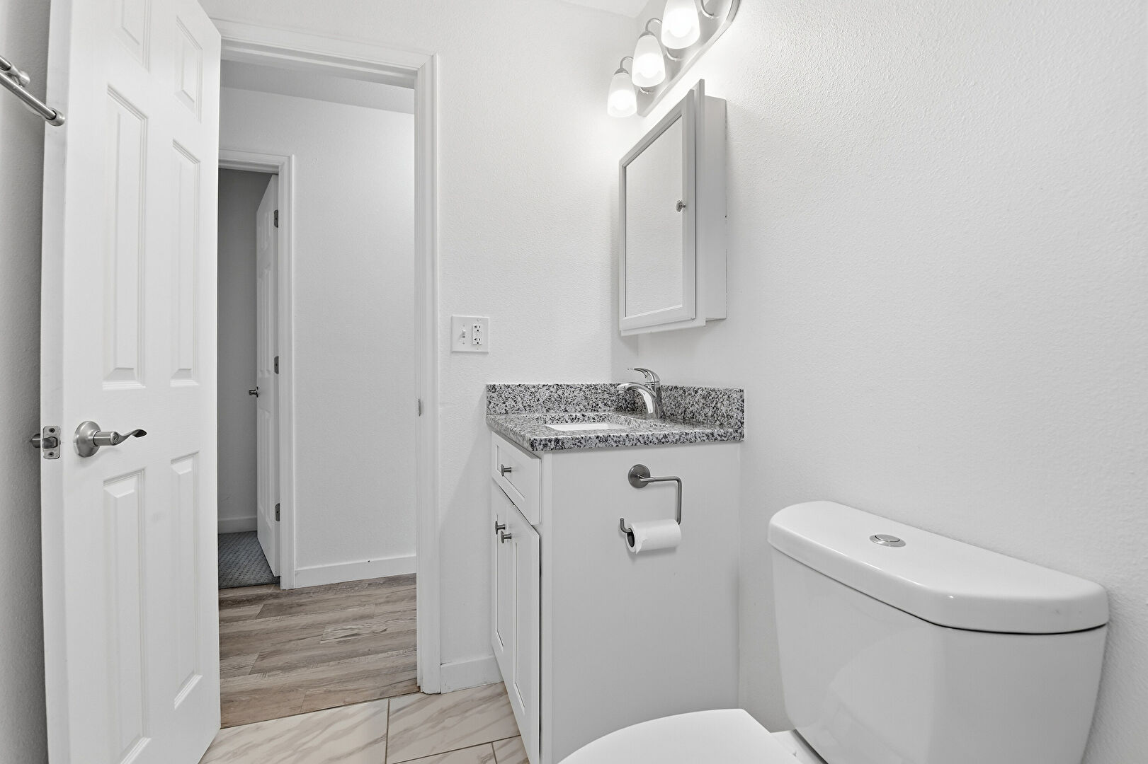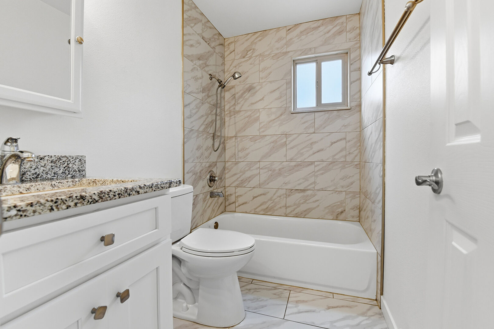 Baseboards Wall, Combined Bath Shower, Drywall, Full Bathroom, Half Bathroom, Natural Light, Vanity, Marble Finish Floor, Wood Finish Floor