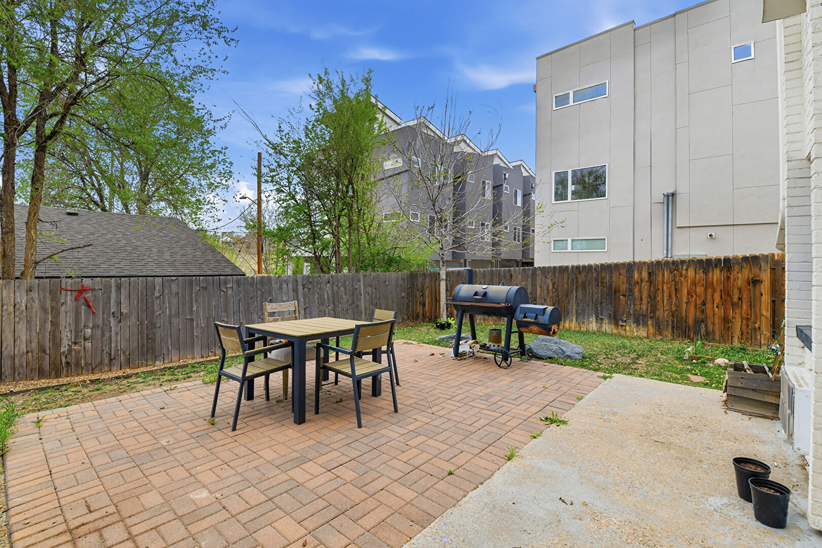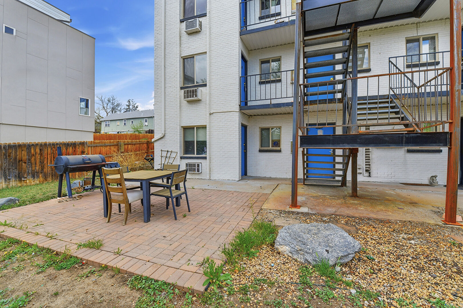 Apartment Complex View, Balcony, Fence, Grill, Outdoor Dining Area, Patio, Window Mounted Ac, Fence, Stairs