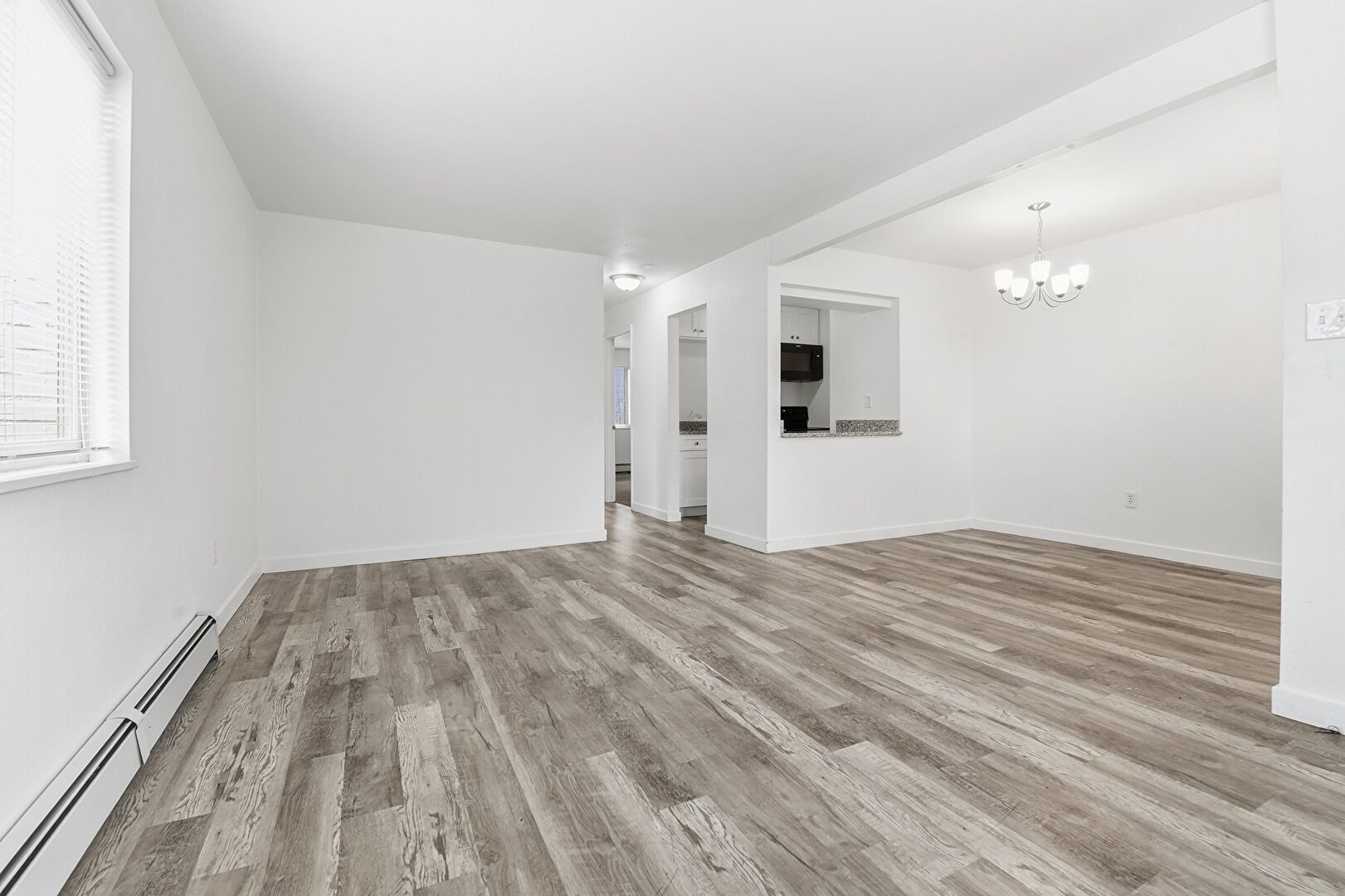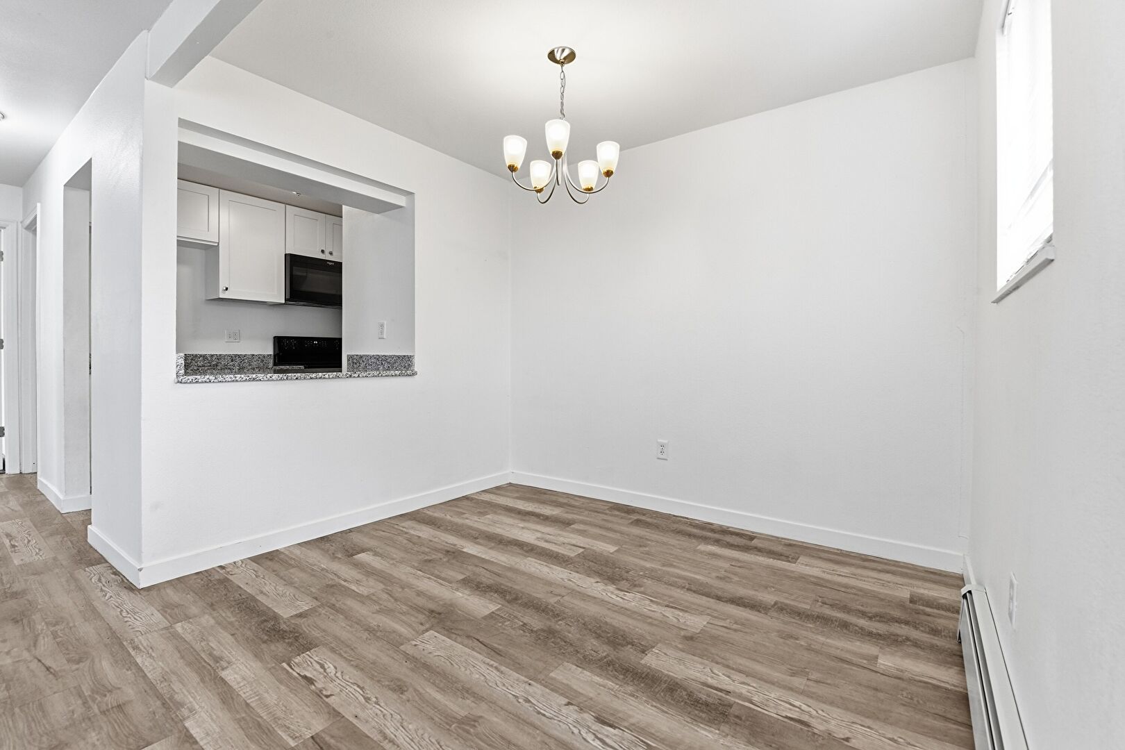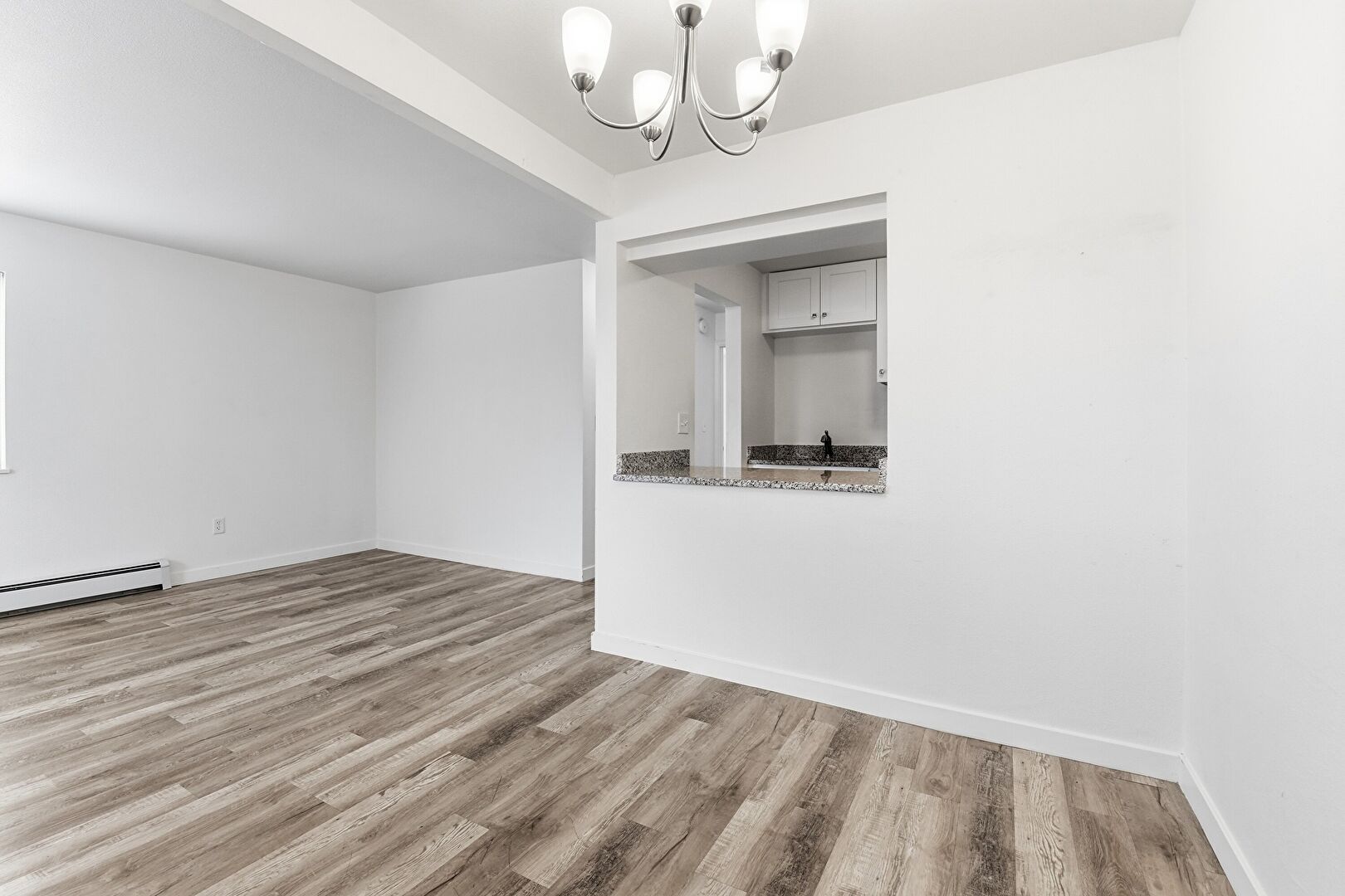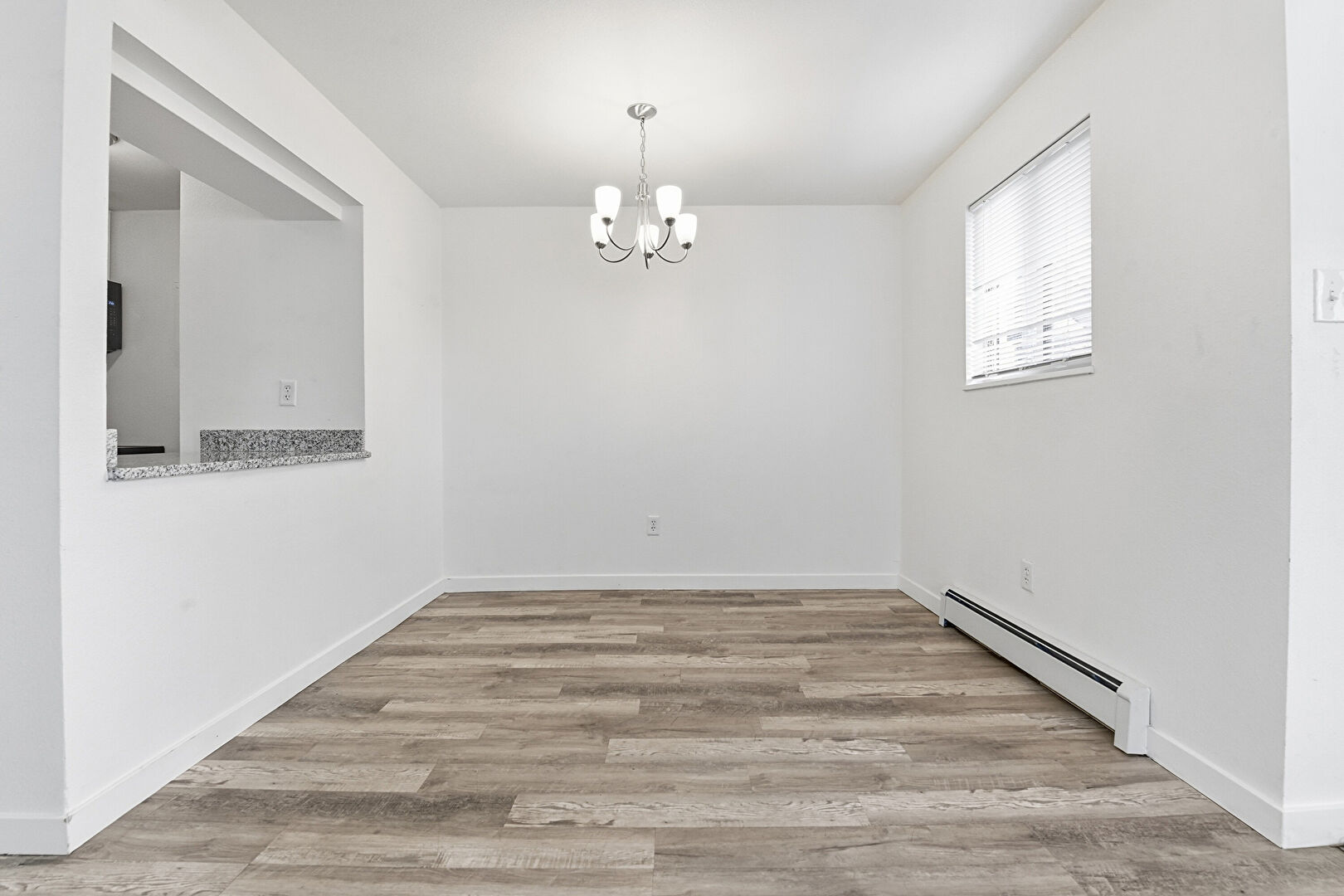 Baseboard Radiator, Baseboards Wall, Drywall, Notable Chandelier, Wood Finish Floor, Drywall, Natural Light