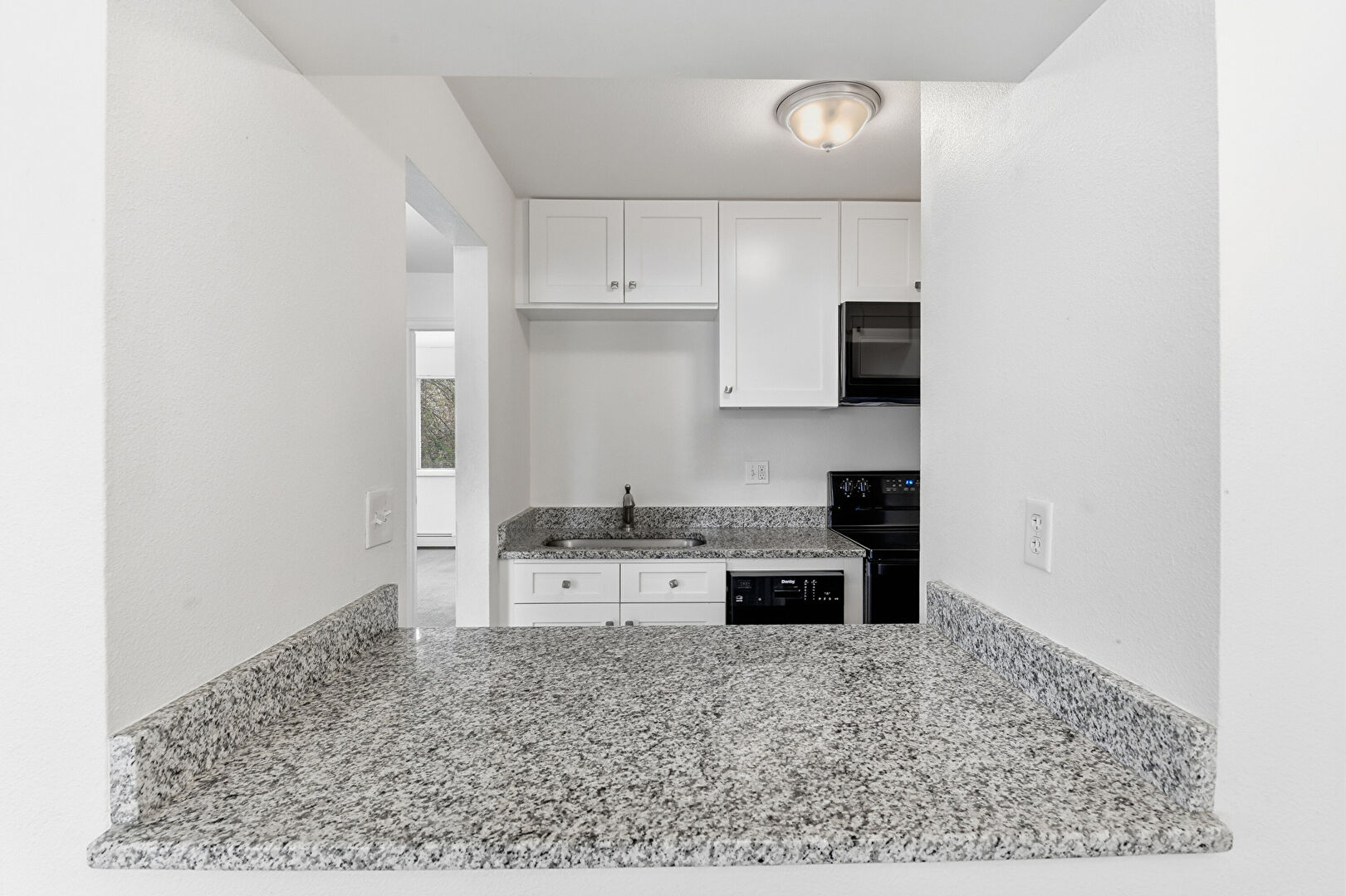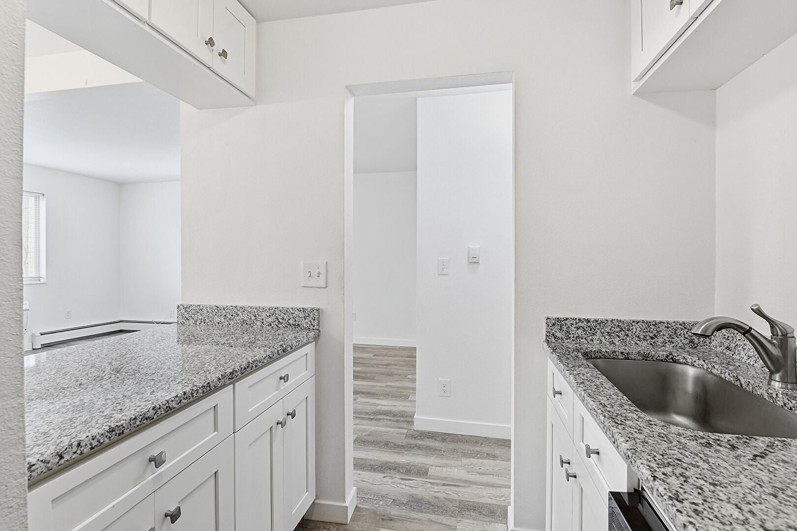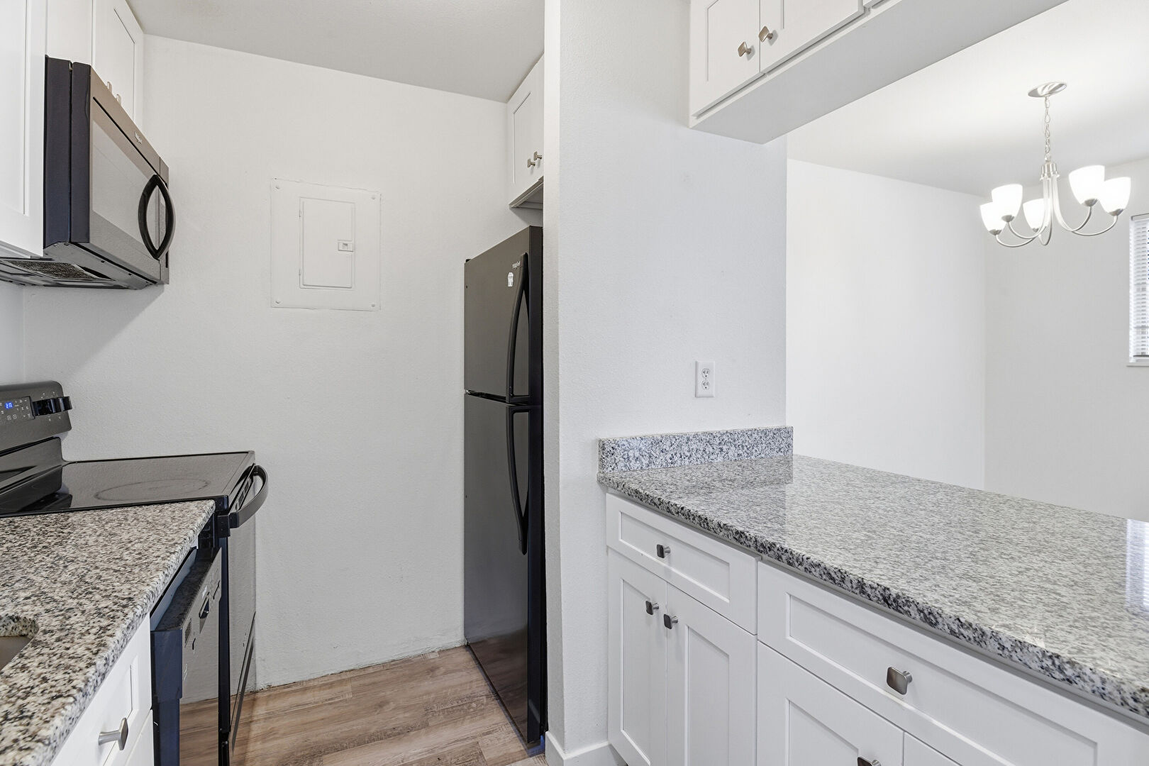 Baseboard Radiator, Baseboards Wall, Drywall, Electric Panel, Kitchen Peninsula, Natural Light, Notable Chandelier, Pass Through Window, Shaker Cabinets, Stone Countertops, Wood Finish Floor, Kitchen Peninsula, Pendant Lighting, Shaker Cabinets, Wood Finish Floor