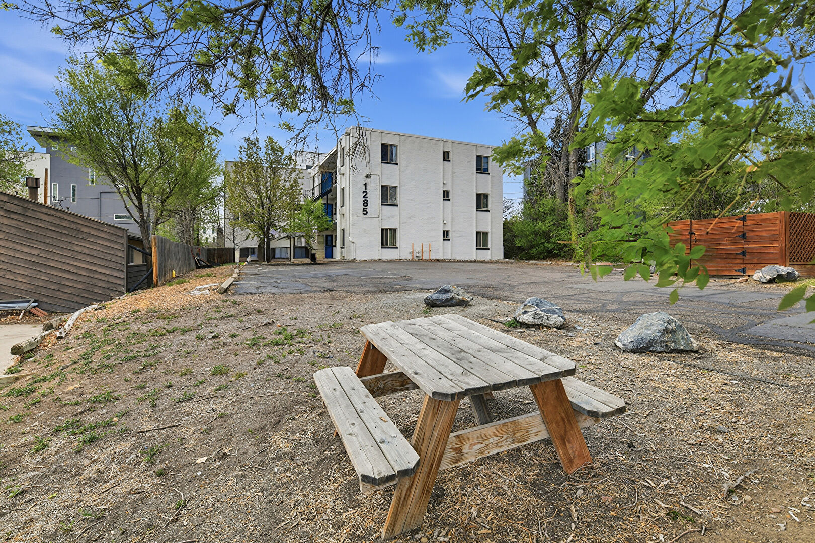 Apartment Complex View, Fence, Parking Lot, Patio, Stucco Siding, Empty Lot, Fence