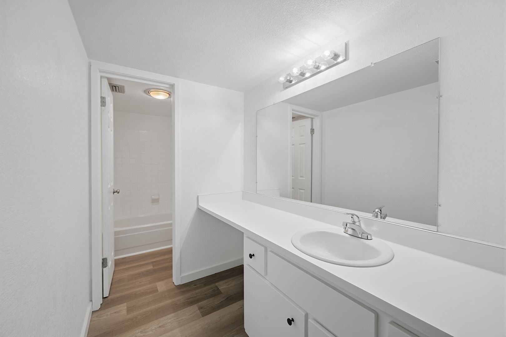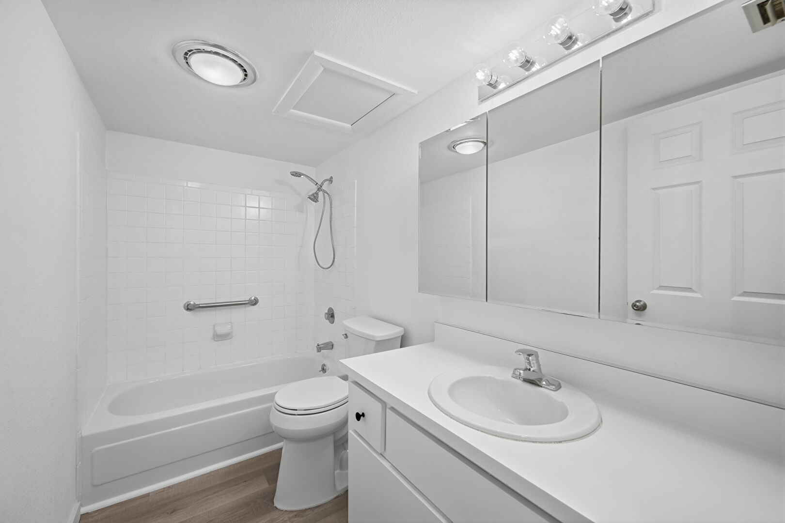 Combined Bath Shower, Full Bathroom, Vanity, Vent, Wood Finish Floor, Drywall