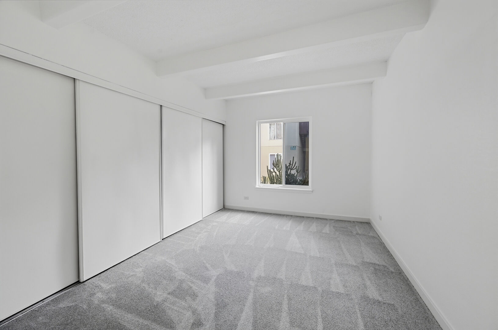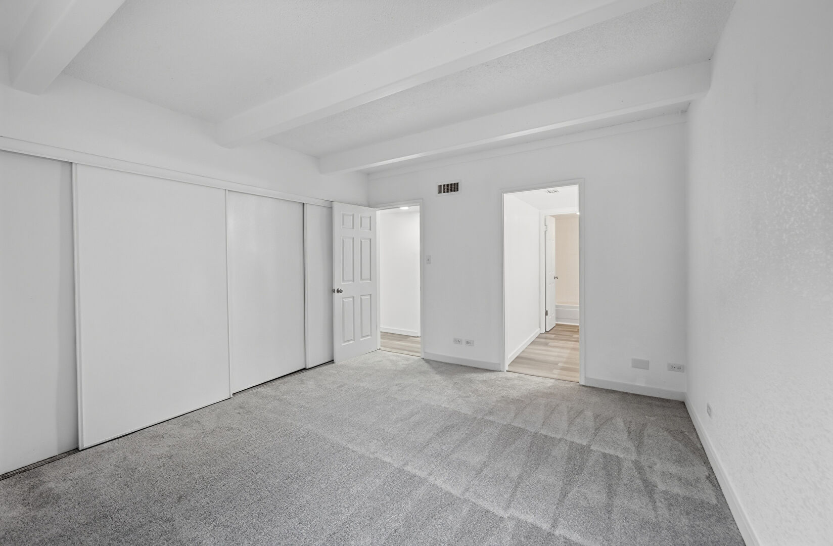 Baseboards Wall, Beamed Ceiling, Carpet, Closet, Natural Light, Textured Wall, Vent, Carpet, Drywall