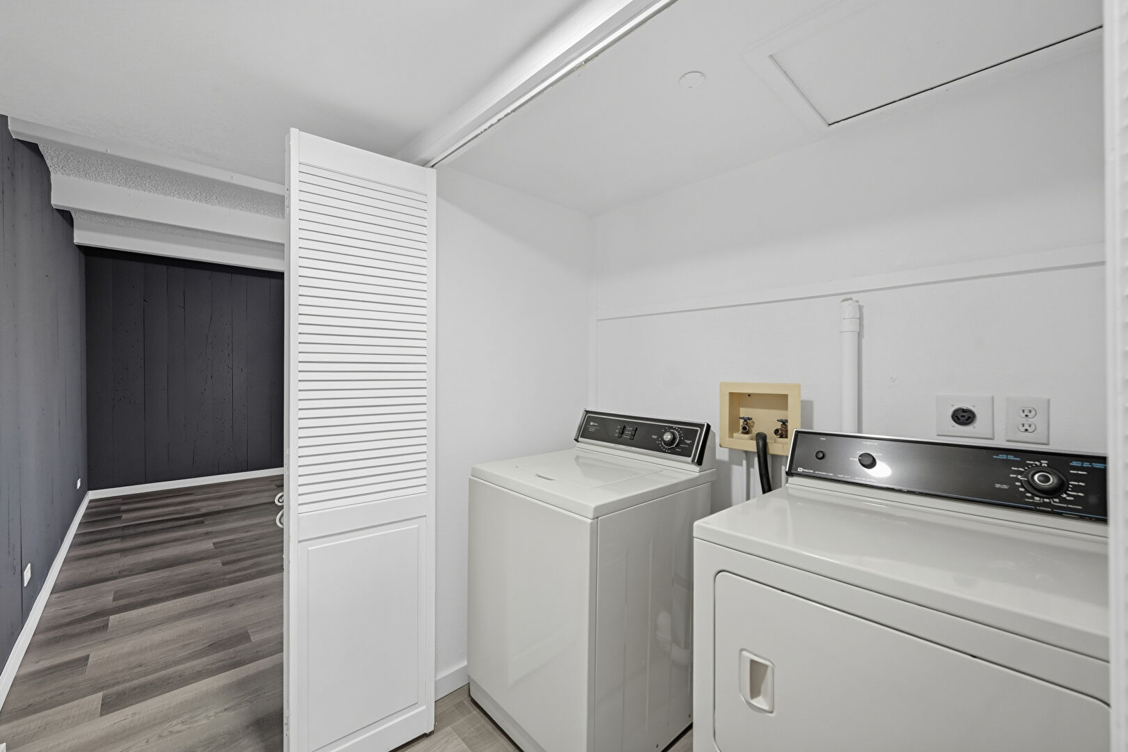 Baseboards Wall, Laundry, Washer Hookup, Wood Finish Floor, Wood Wall, Electric Dryer Hookup