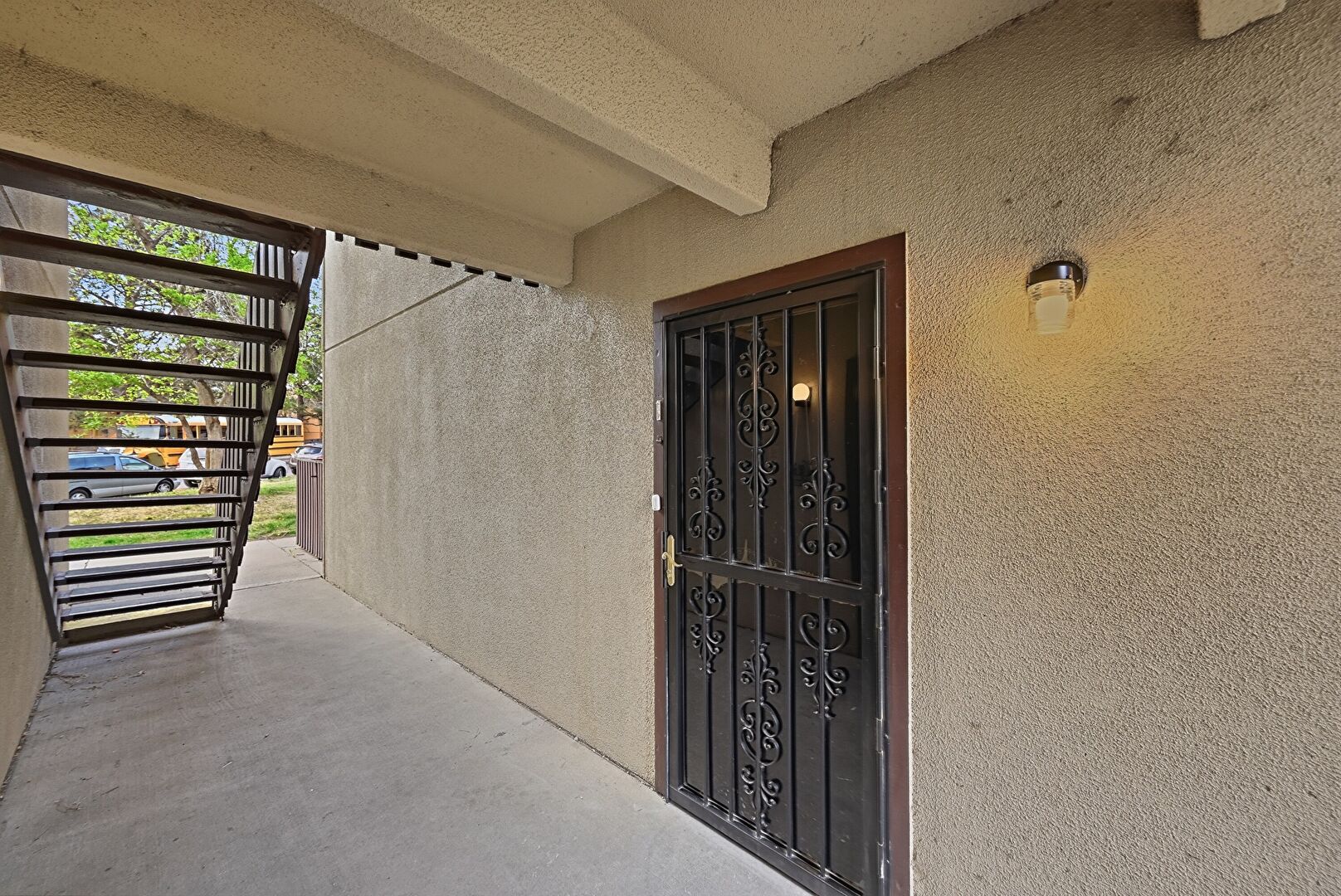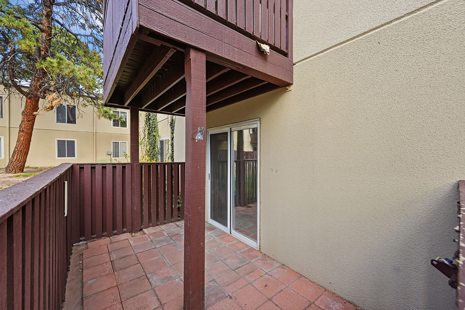 Apartment Complex View, Balcony, Stucco Siding, Lawn