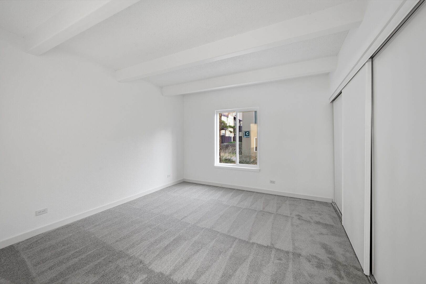 Baseboards Wall, Beamed Ceiling, Carpet, Closet, Drywall, Natural Light