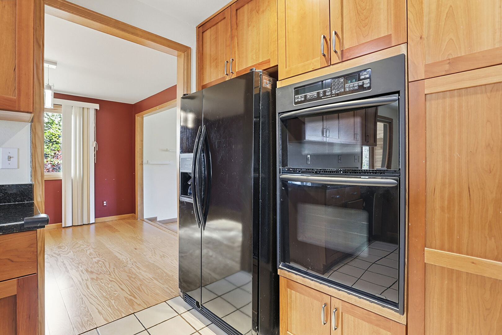 Baseboards Wall, Double Oven, Drywall, Fireplace, G Shaped Kitchen, Kitchen Peninsula, Medium Brown Cabinets, Natural Light, Opens To Living Area, Recessed Lighting, Shaker Cabinets, Stone Countertops, Tile Floor, Vent, Wood Finish Floor, Wood Wall, Baseboards Wall, Drywall, Natural Light, Tile Floor