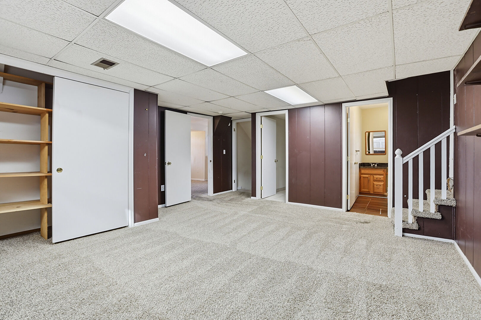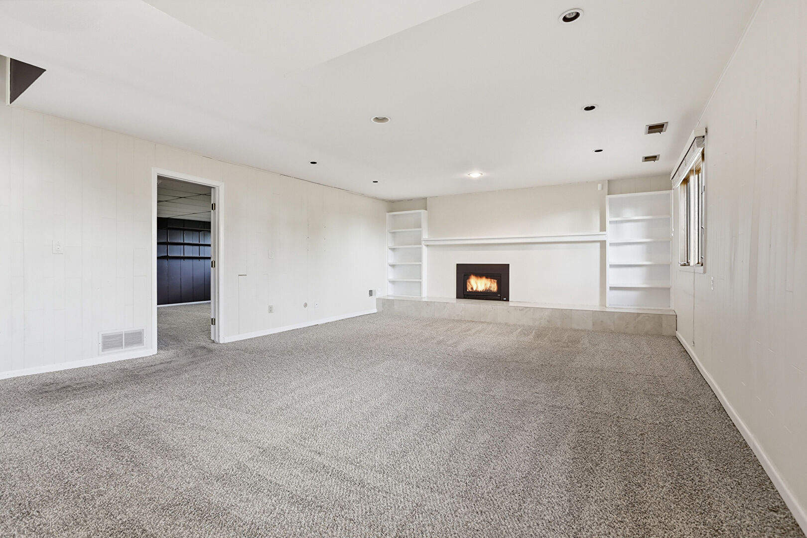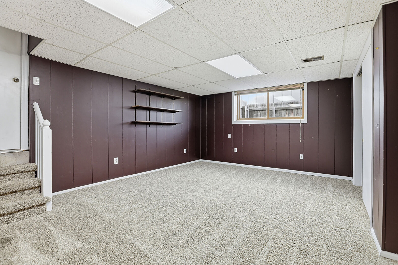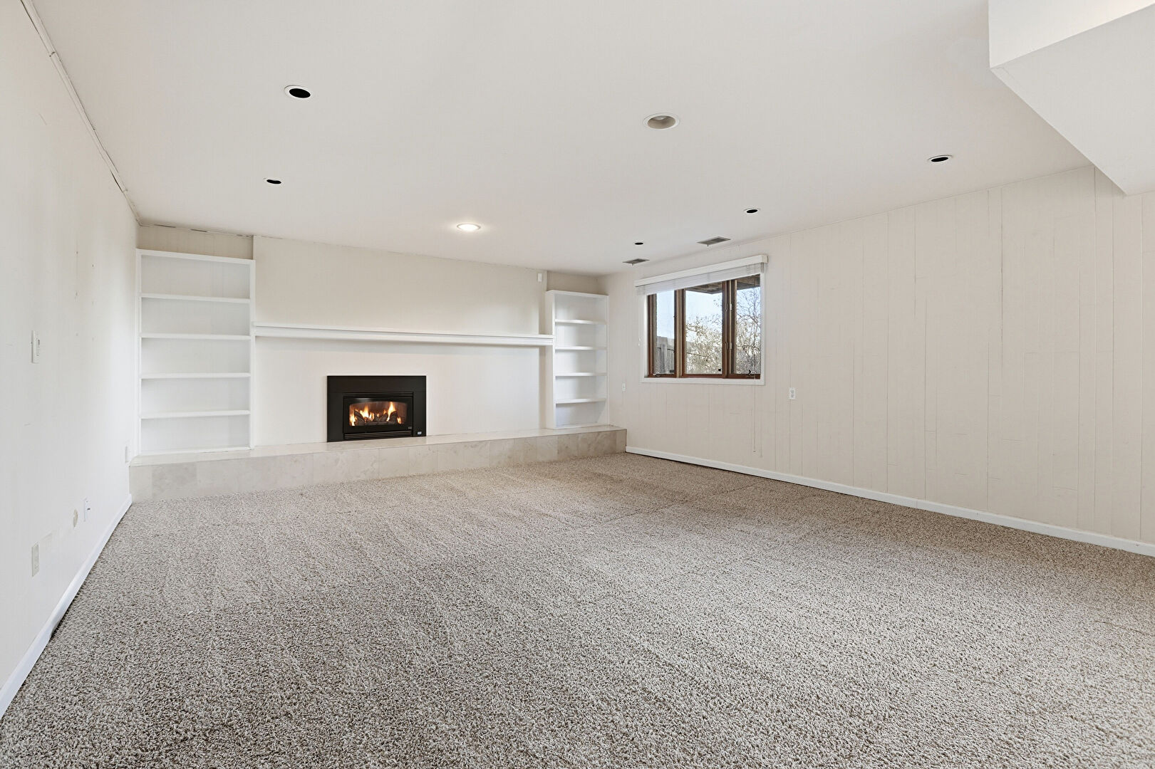 Baseboards Wall, Basement, Built In Shelves, Carpet, Cathedral Ceiling, Drop Ceiling, Drywall, High Ceiling, Natural Light, Recessed Lighting, Stairs, Vaulted Ceiling, Vent, Wood Finish Floor, Wood Wall, Carpet, Fireplace, Natural Light, Wood Finish Floor, Wood Wall
