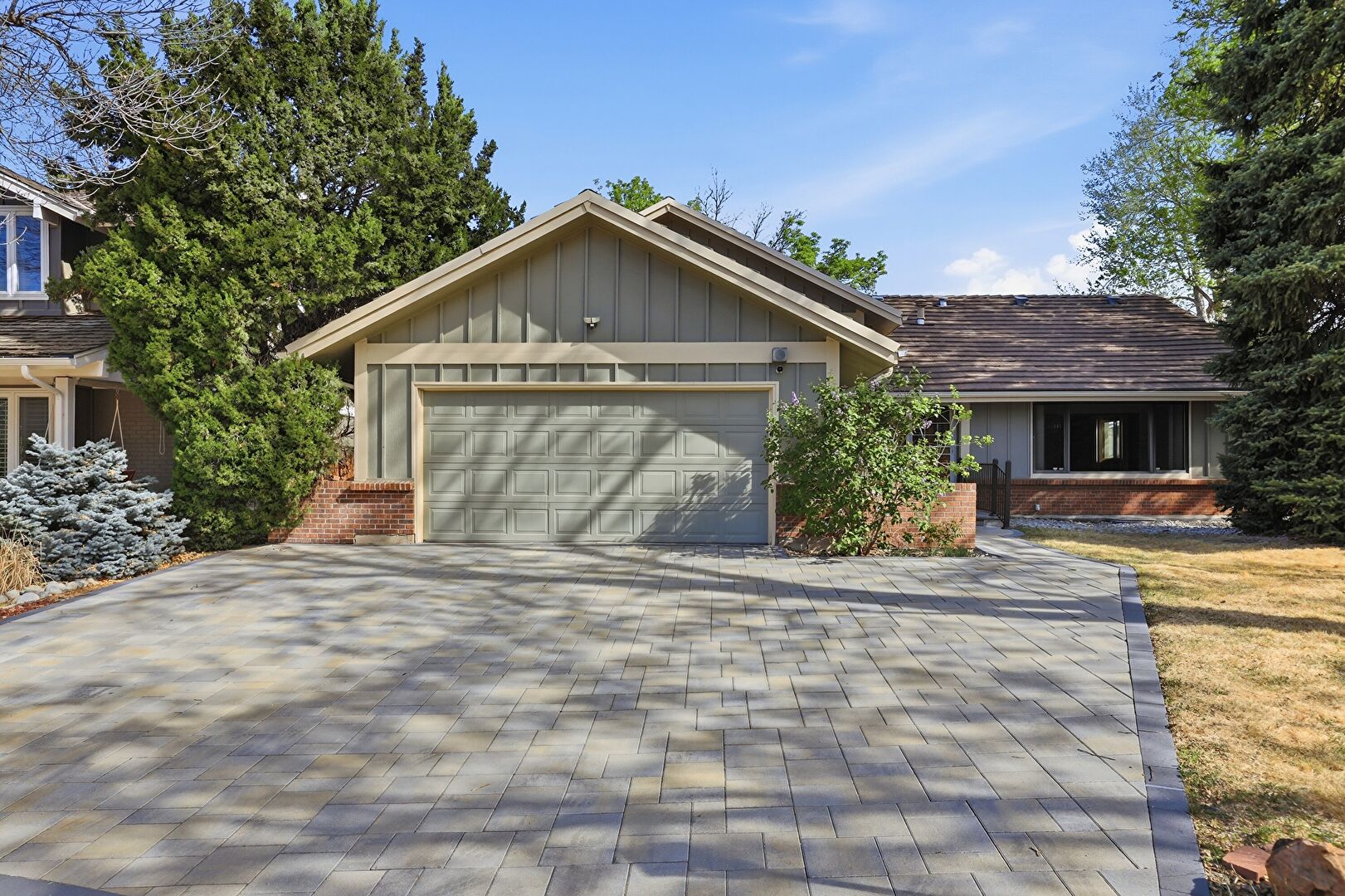 Board Batten Siding, Brick Siding, Concrete Foundation, Dormer Roof, Downspout, Driveway, Gutters, Lawn, Shingle Roof, Vertical Siding, Brick Siding, Gutters, Shingle Roof