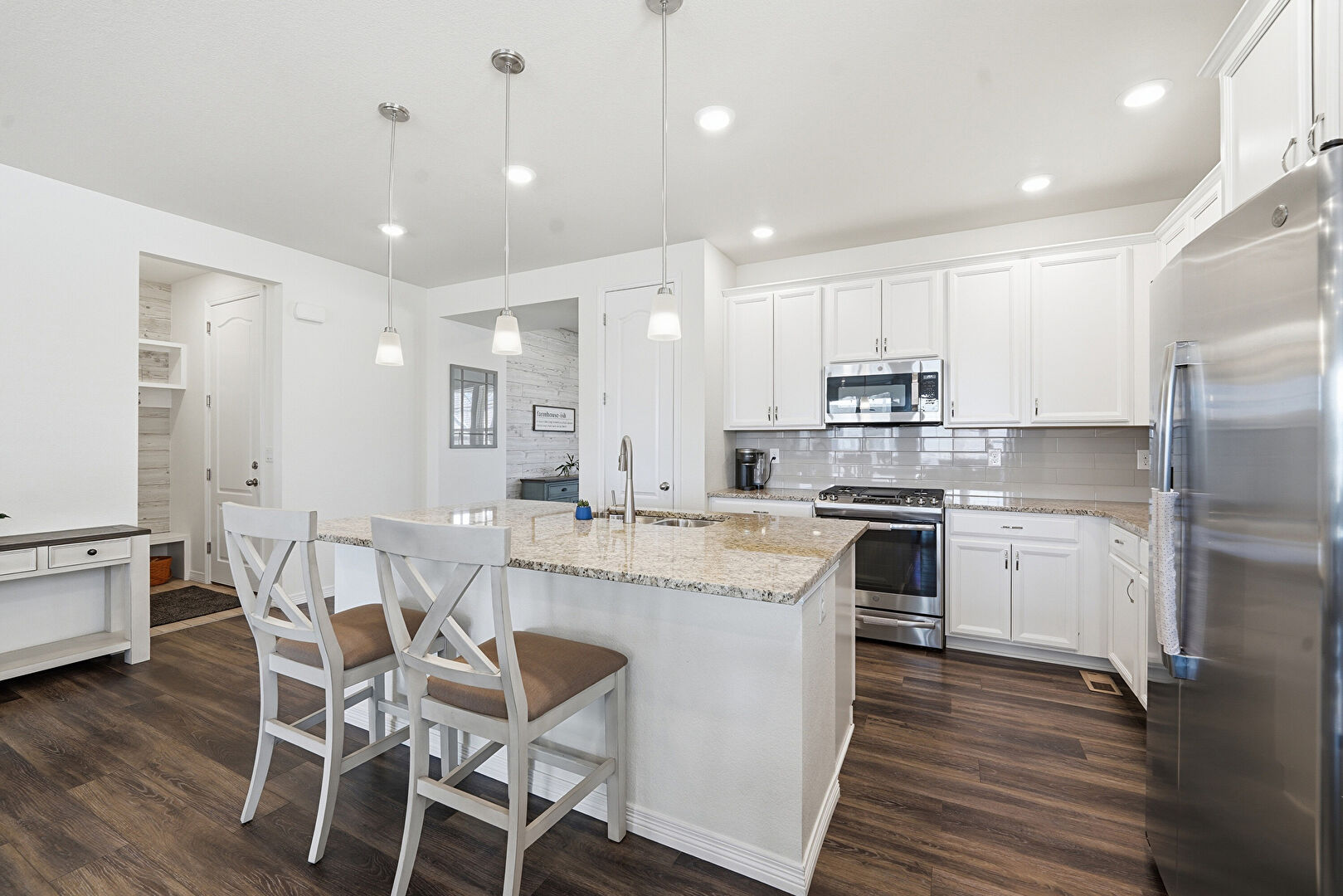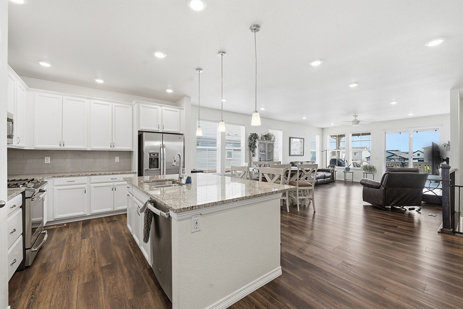 Baseboards Wall, Ceiling Fan, Crown Molding Cabinets, Drywall, Kitchen Bar, Kitchen Island, L Shaped Kitchen, Natural Light, Opens To Living Area, Pendant Lighting, Recessed Lighting, Shaker Cabinets, Stone Countertops, Wood Finish Floor, Ceiling Fan, Crown Molding Cabinets, Drywall, Shaker Cabinets