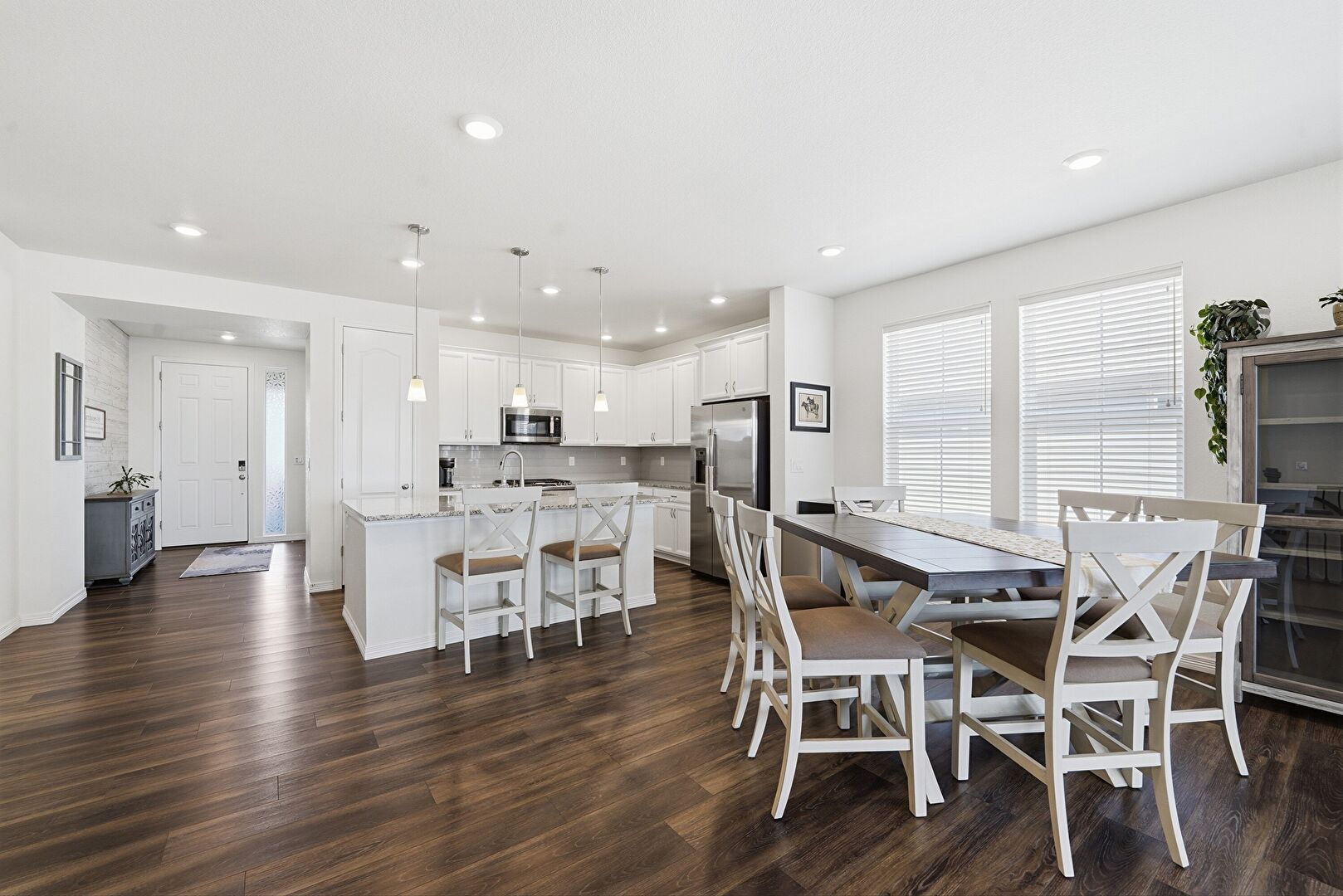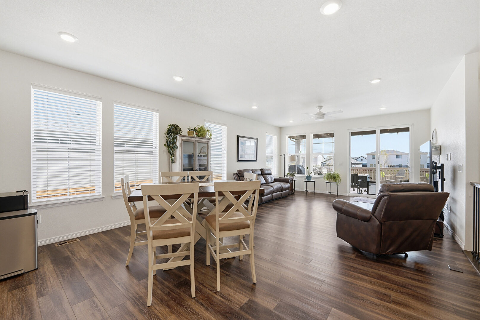 Baseboards Wall, Drywall, L Shaped Kitchen, Natural Light, Recessed Lighting, Vent, Wood Finish Floor, Ceiling Fan, Natural Light