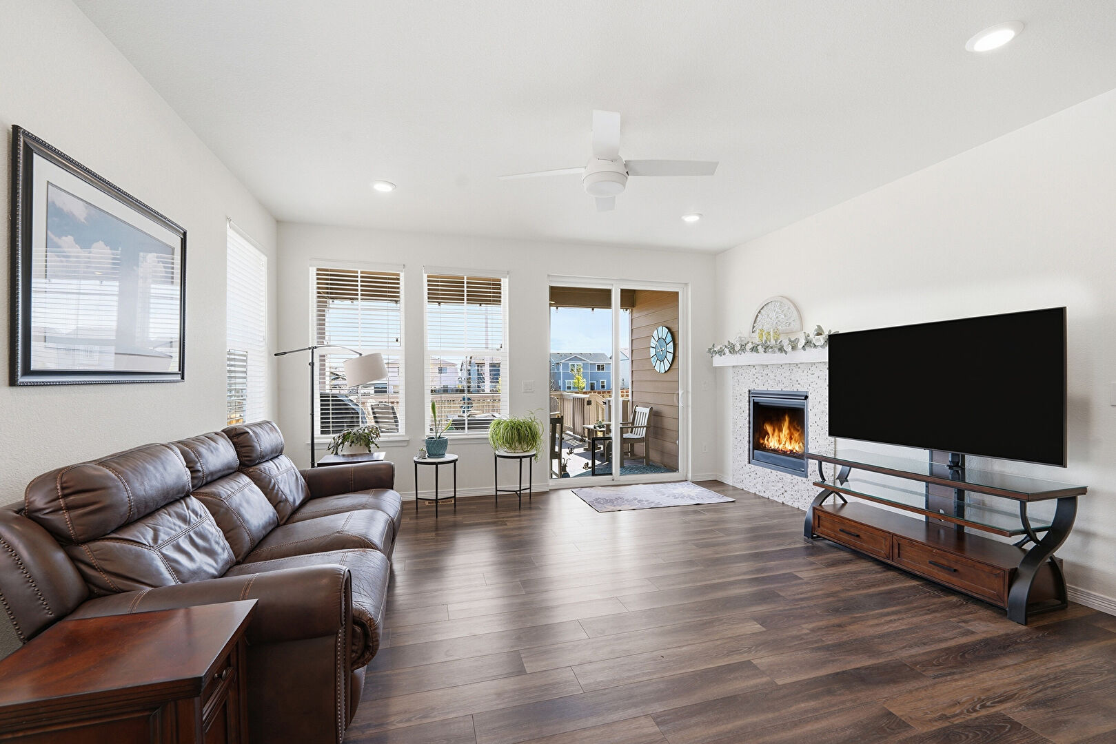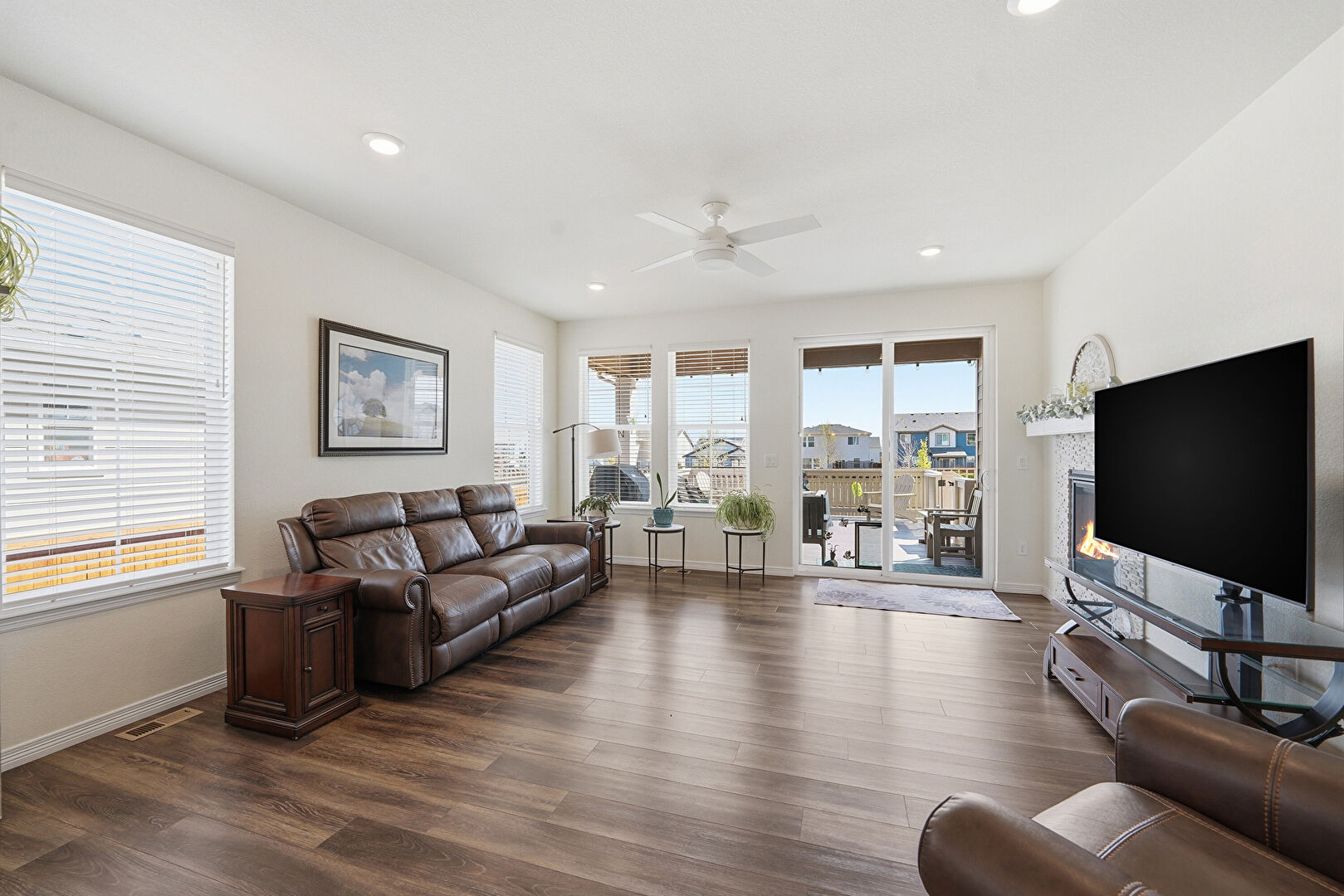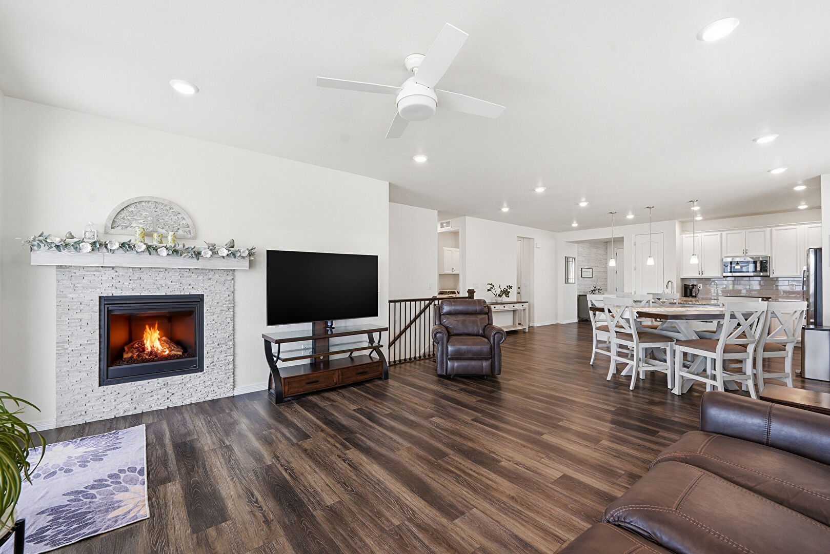 Baseboards Wall, Ceiling Fan, Drywall, Fireplace, Natural Light, Recessed Lighting, Residential View, Vaulted Ceiling, Vent, Wood Finish Floor, Ceiling Fan, Fireplace, Natural Light, Wood Finish Floor