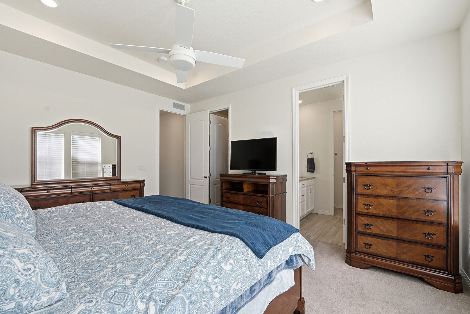 Carpet, Ceiling Fan, Drywall, Ensuite Bathroom, Natural Light, Recessed Lighting, Tray Ceiling, Vent, Baseboards Wall