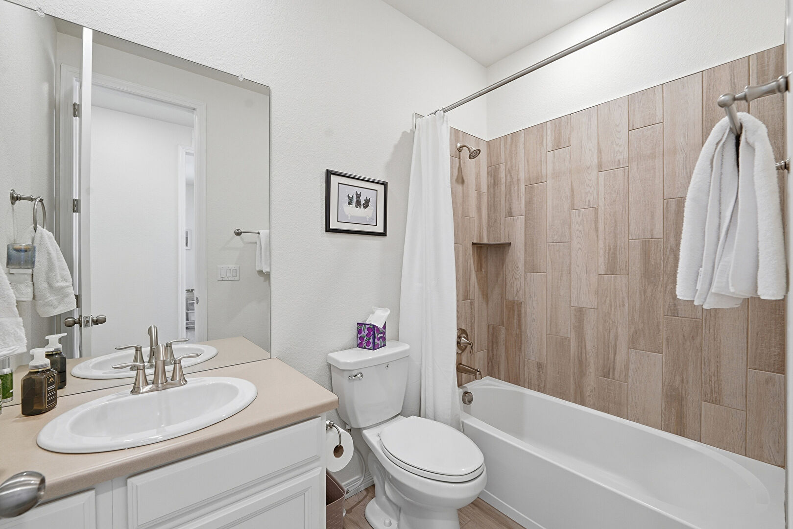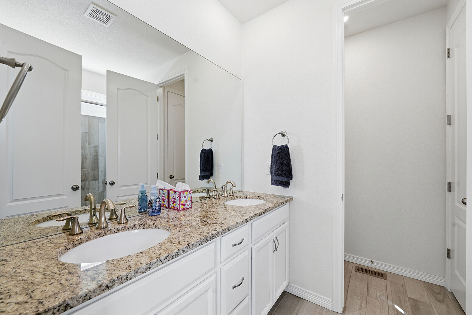Baseboards Wall, Double Vanity, Drywall, Full Bathroom, Natural Light, Vent, Wood Finish Floor