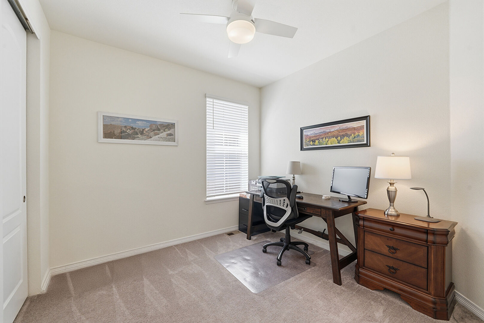 Baseboards Wall, Carpet, Ceiling Fan, Drywall, Natural Light, Office Area, Wood Finish Floor, Drywall, Natural Light