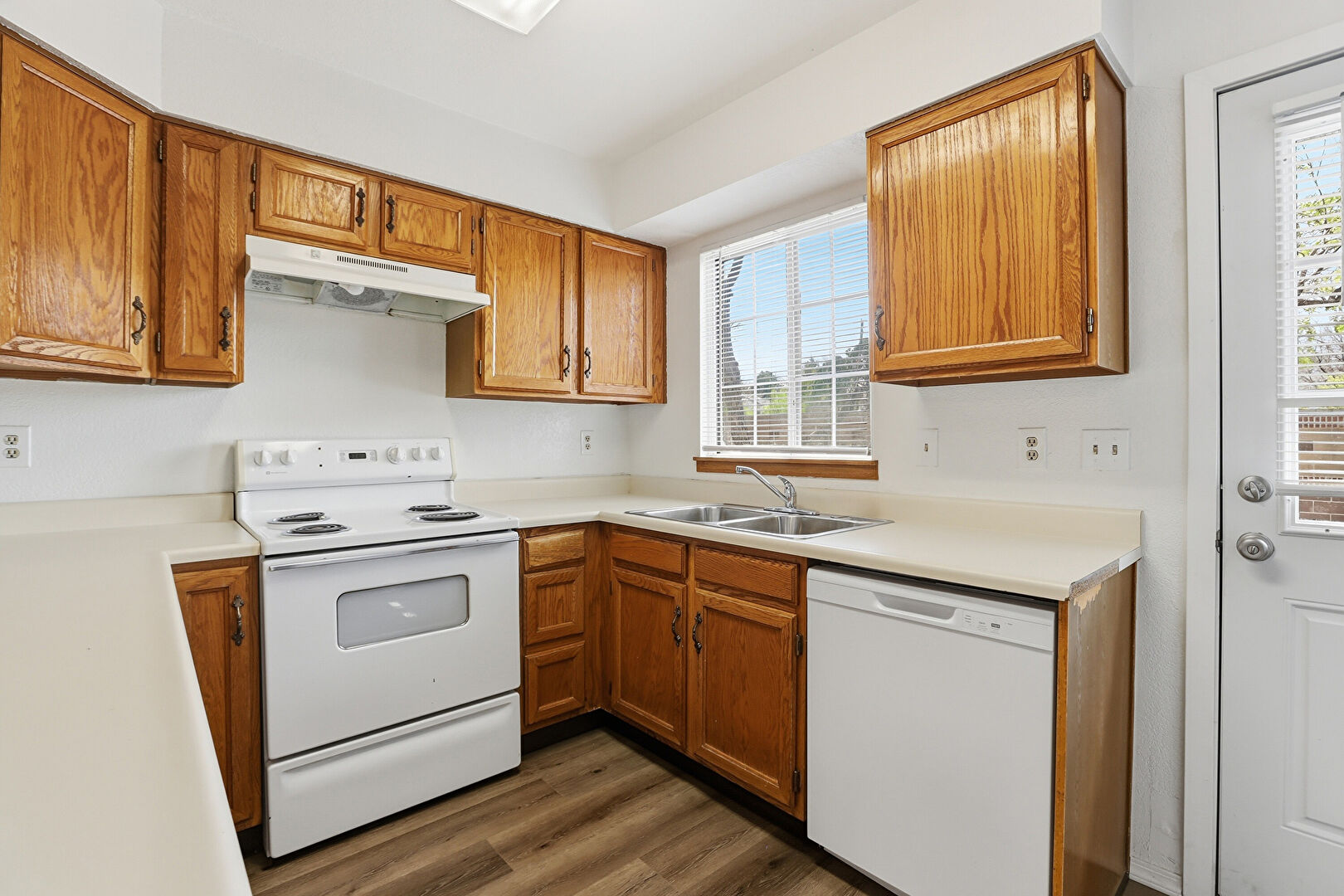 Baseboards Wall, Ceiling Fan, Drywall, Kitchen Peninsula, Medium Brown Cabinets, Natural Light, Shaker Cabinets, Textured Ceiling, Vent, Visible Hinge Cabinets, Wood Finish Floor, Drywall, Medium Brown Cabinets, Opens To Living Area, Shaker Cabinets