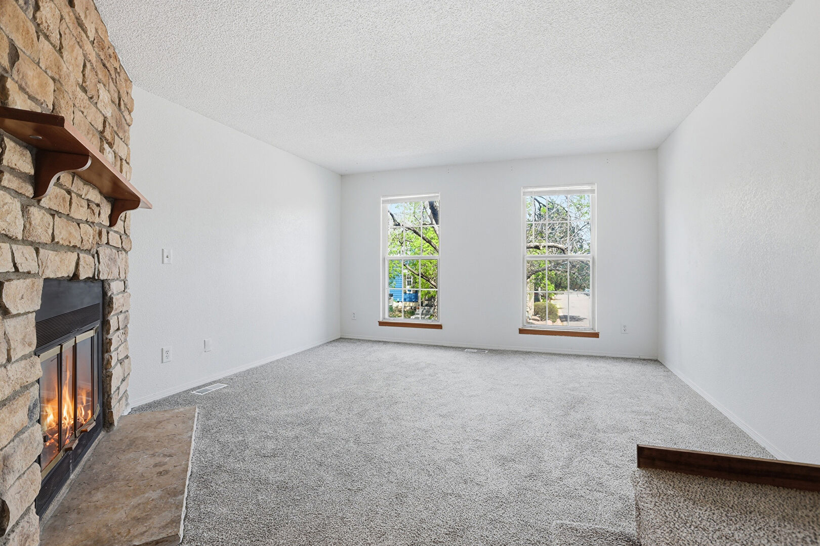 Baseboards Wall, Carpet, Ceiling Fan, Drywall, Fireplace, Natural Light, Stairs, Textured Ceiling, Vent, Baseboards Wall, Natural Light, Textured Ceiling