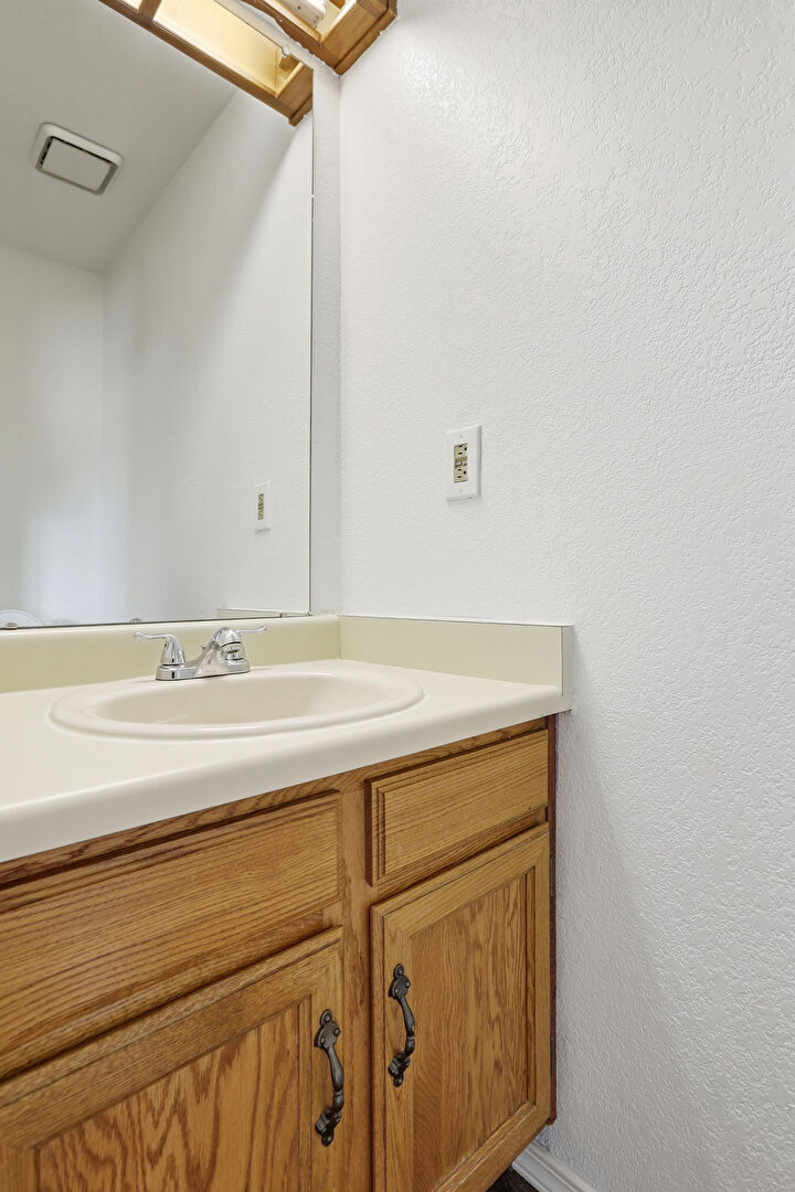 Drywall, Full Bathroom, Textured Wall, Vanity, Vent, Wood Finish Floor, Combined Bath Shower, Vent