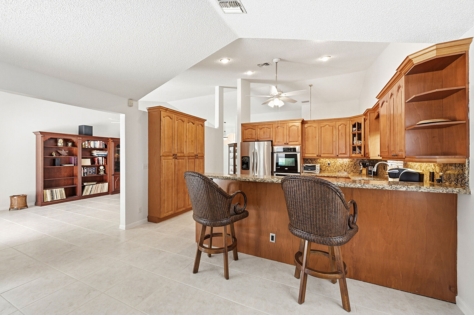 Arched Cabinets, Baseboards Wall, Cathedral Ceiling, Ceiling Fan, Crown Molding Cabinets, Double Oven, Drywall, G Shaped Kitchen, Glass Insert Cabinets, High Ceiling, Kitchen Bar, Kitchen Peninsula, Medium Brown Cabinets, Natural Light, Open Shelves, Opens To Living Area, Raised Cabinets, Recessed Lighting, Stone Countertops, Textured Ceiling, Tile Floor, Toaster, U Shaped Kitchen, Vaulted Ceiling, Vent, Ceiling Fan, G Shaped Kitchen, Glass Insert Cabinets, Kitchen Peninsula, Toaster