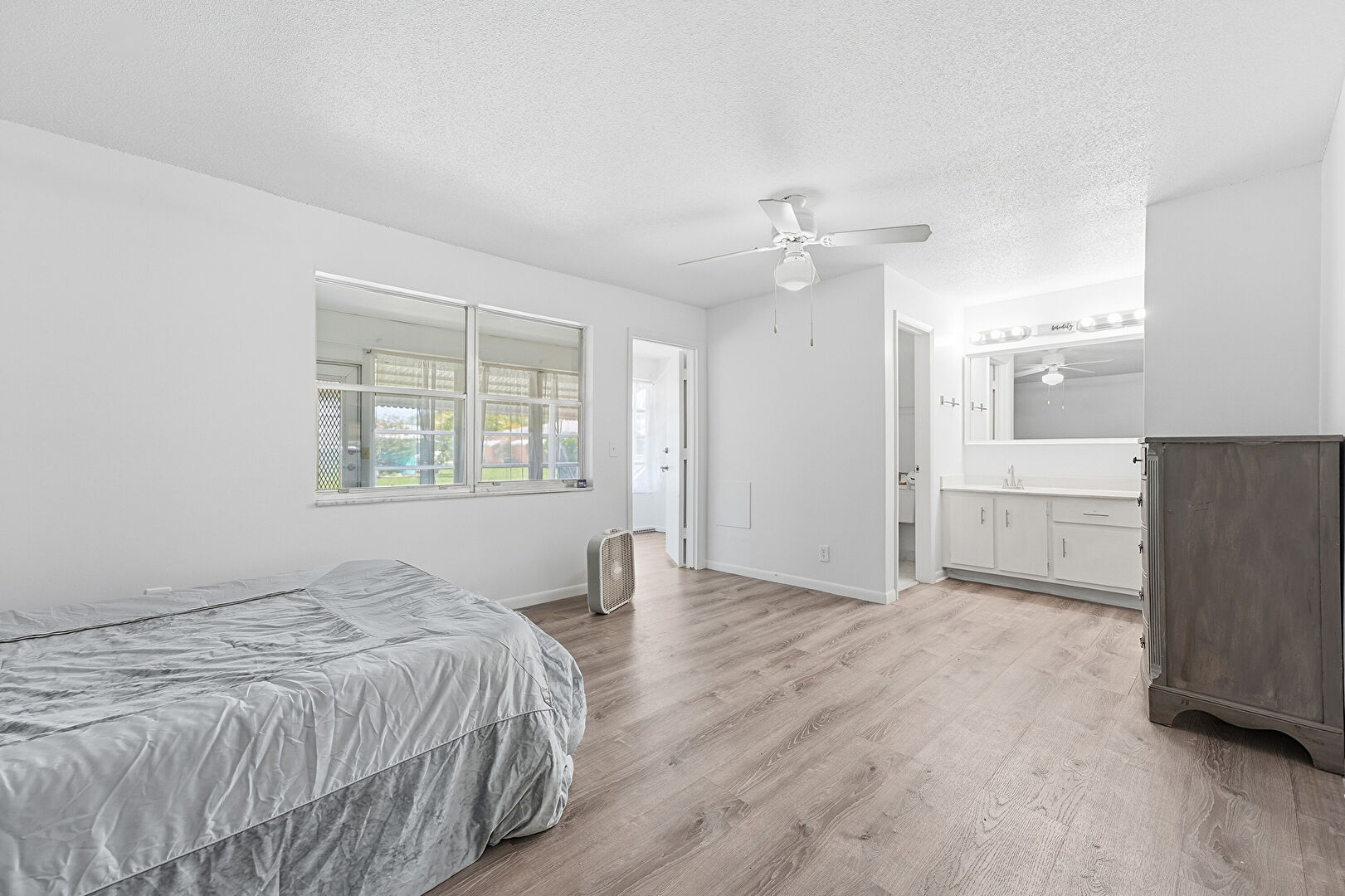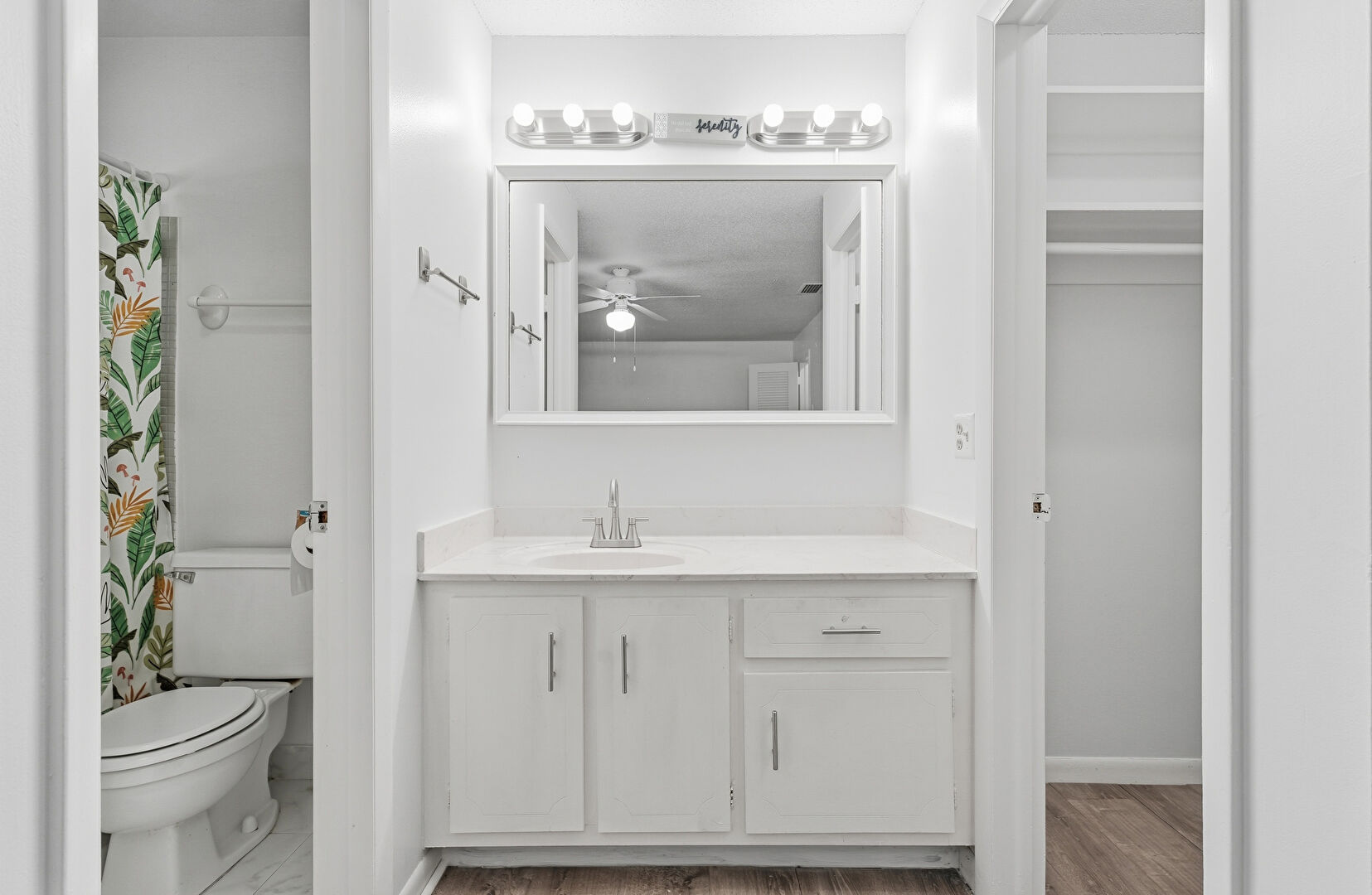 Baseboards Wall, Ceiling Fan, Combined Bath Shower, Drywall, Ensuite Bathroom, Full Bathroom, Natural Light, Textured Ceiling, Vanity, Wood Finish Floor, Baseboards Wall, Ceiling Fan, Natural Light