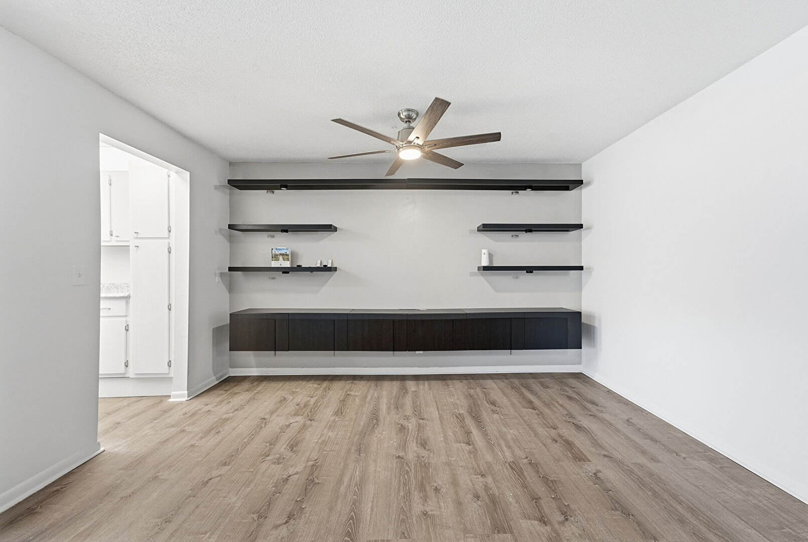 Baseboards Wall, Drywall, Textured Ceiling, Wood Finish Floor, Ceiling Fan