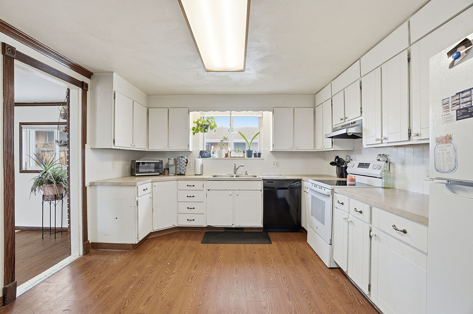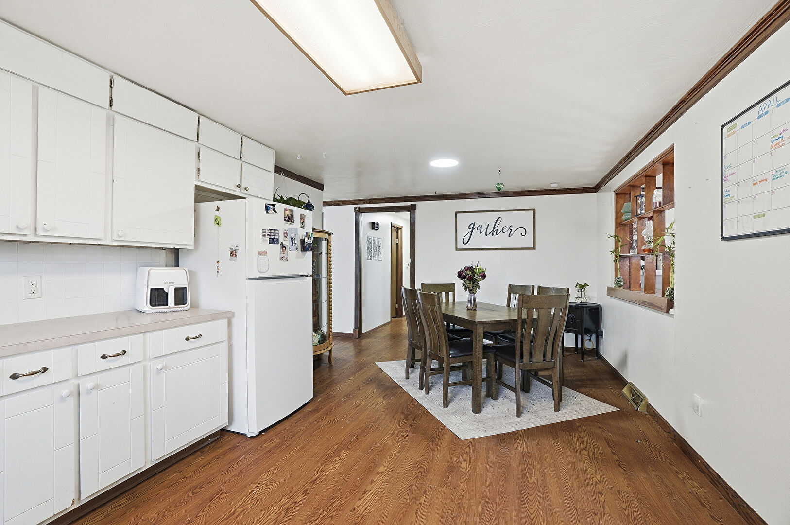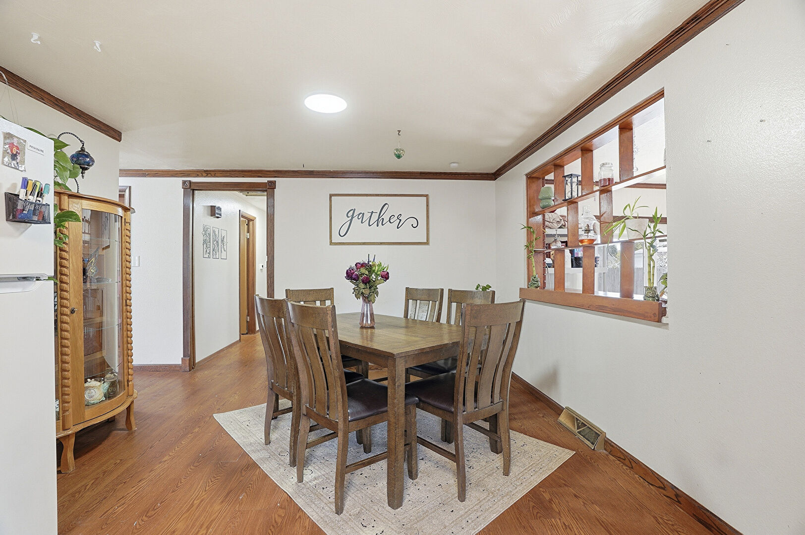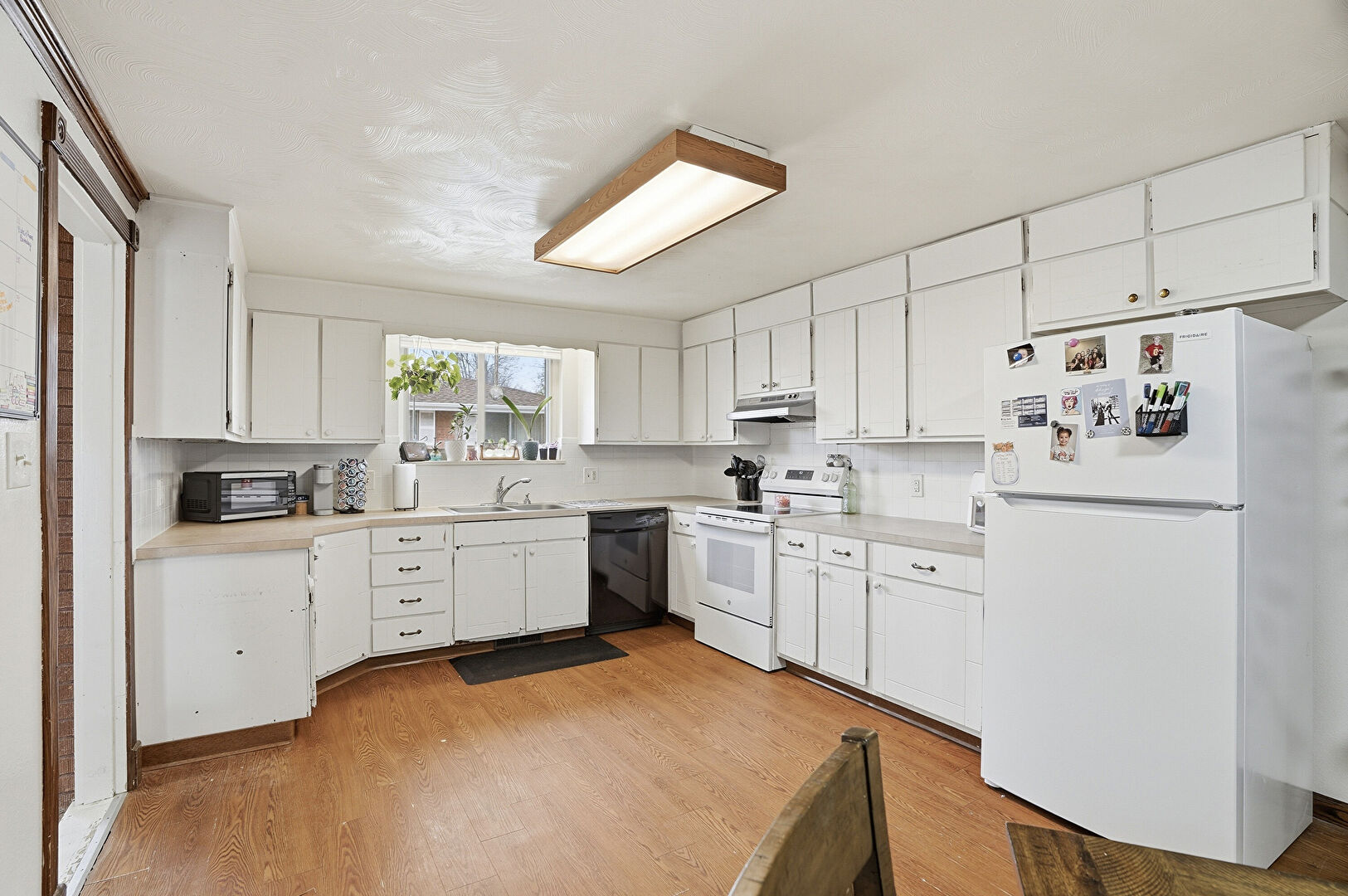 Baseboards Wall, Crown Molding, Drywall, L Shaped Kitchen, Natural Light, Recessed Lighting, Vent, Wood Finish Floor, Baseboards Wall, Crown Molding, Natural Light