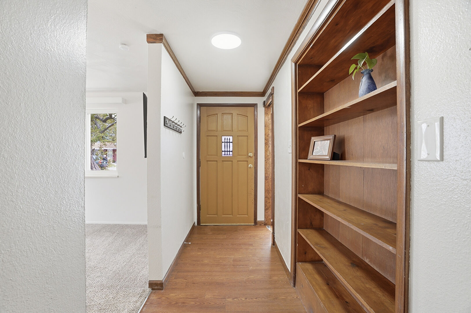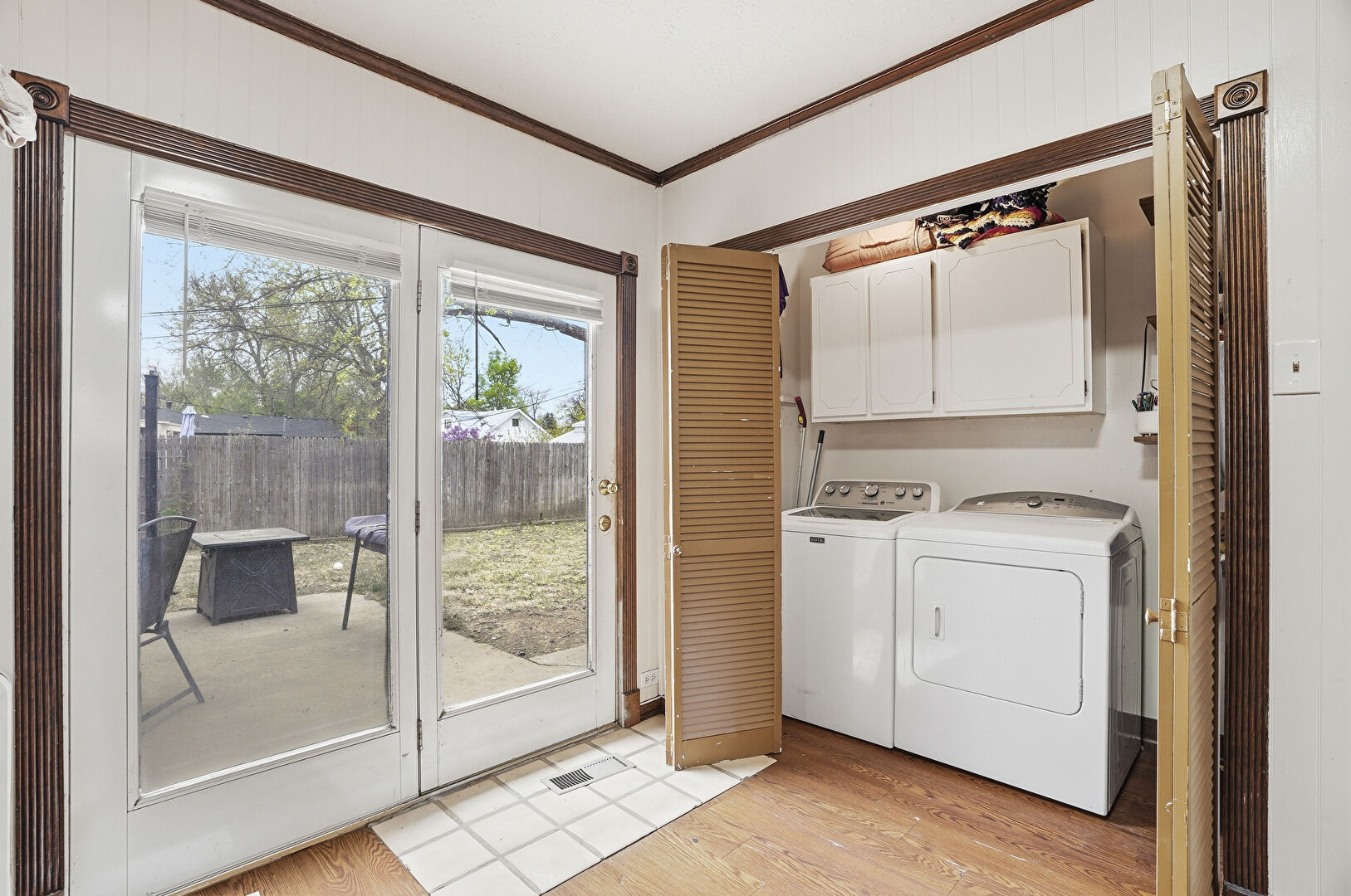 Crown Molding, Natural Light, Wood Finish Floor, Wood Wall, Laundry