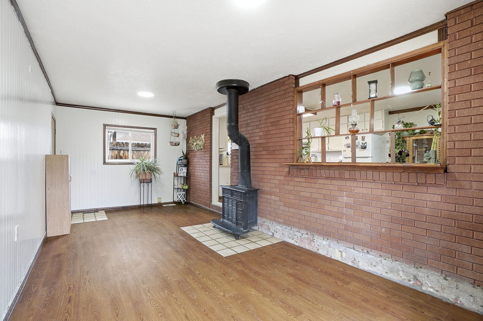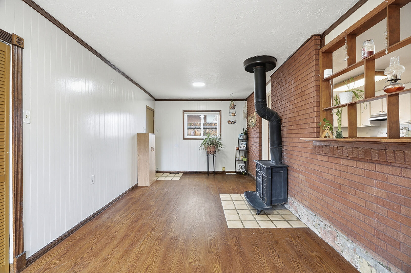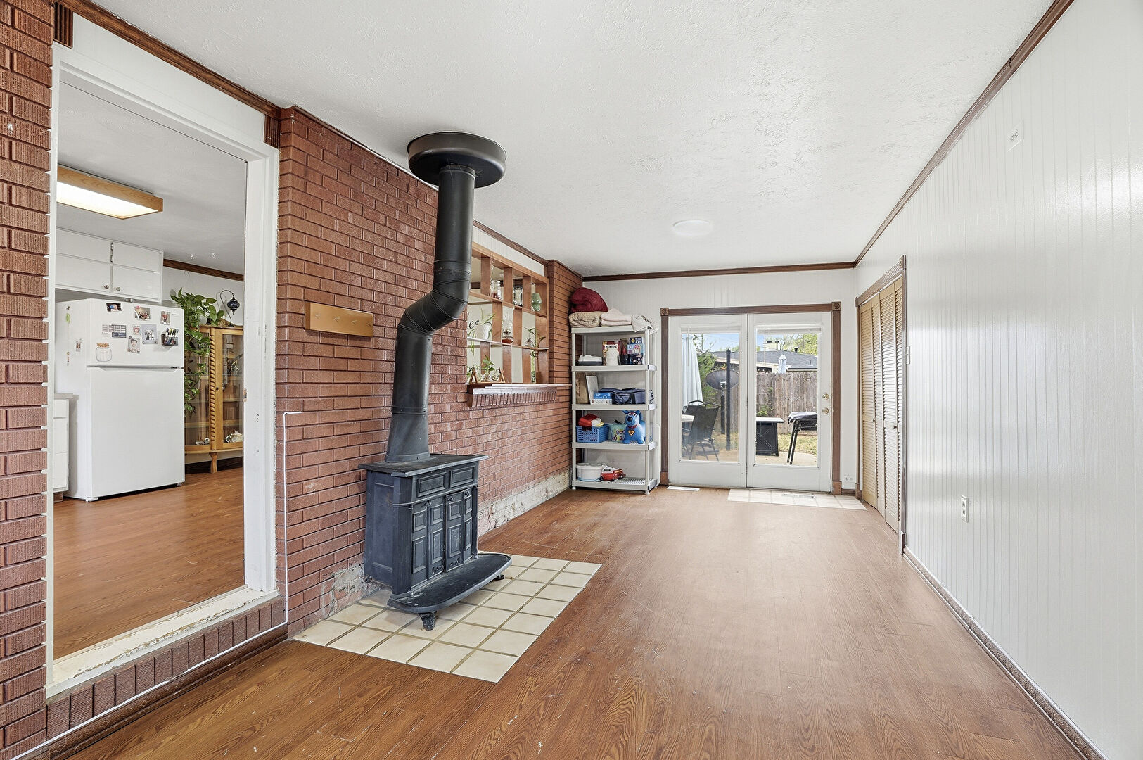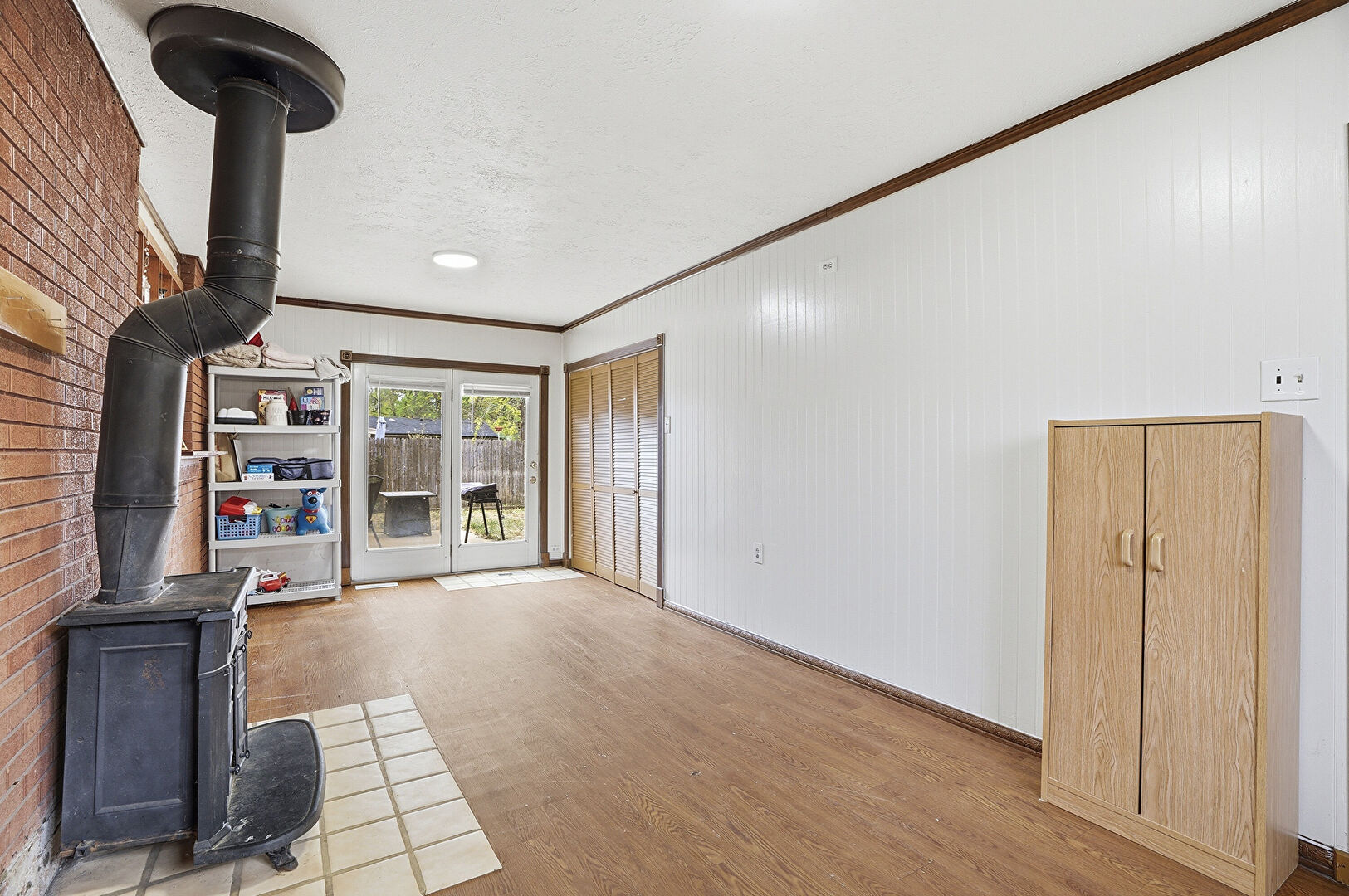 Baseboards Wall, Brick Wall, Crown Molding, Natural Light, Textured Ceiling, Wood Finish Floor, Wood Stove, Wood Wall, Natural Light, Wood Finish Floor, Wood Stove, Wood Wall