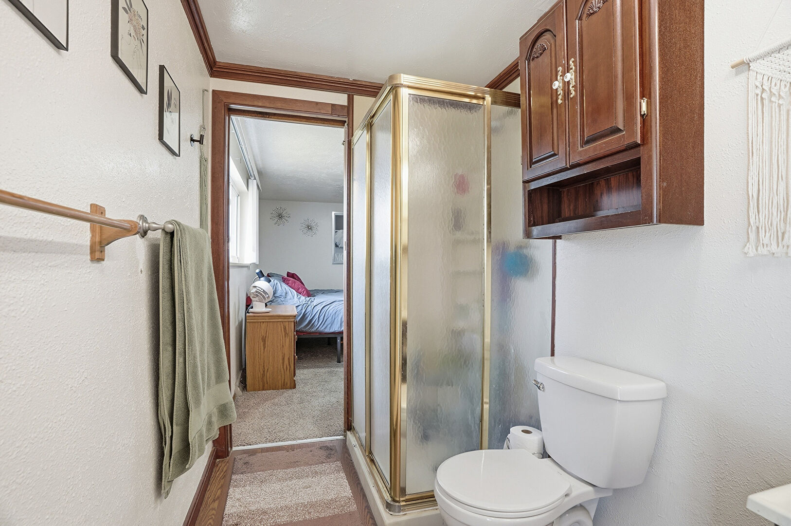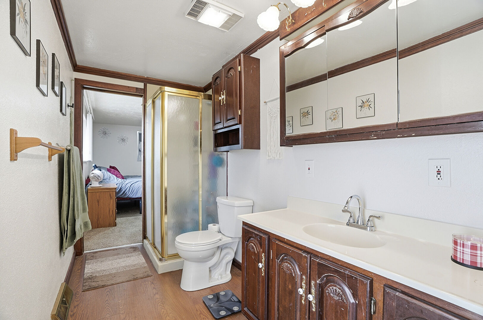 Carpet, Crown Molding, Drywall, Ensuite Bathroom, Full Bathroom, Natural Light, Textured Wall, Vent, Wood Finish Floor, Baseboards Wall, Vanity