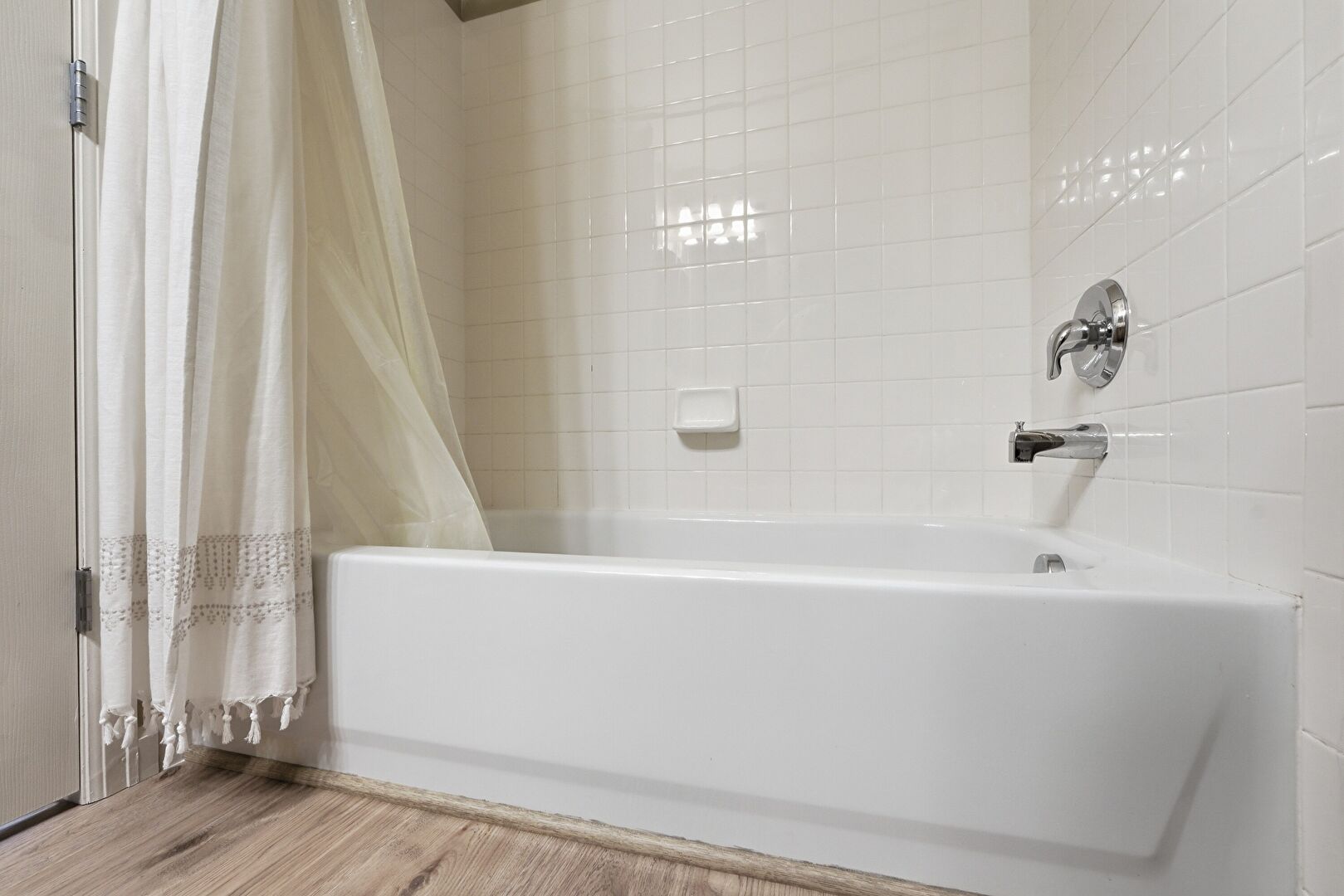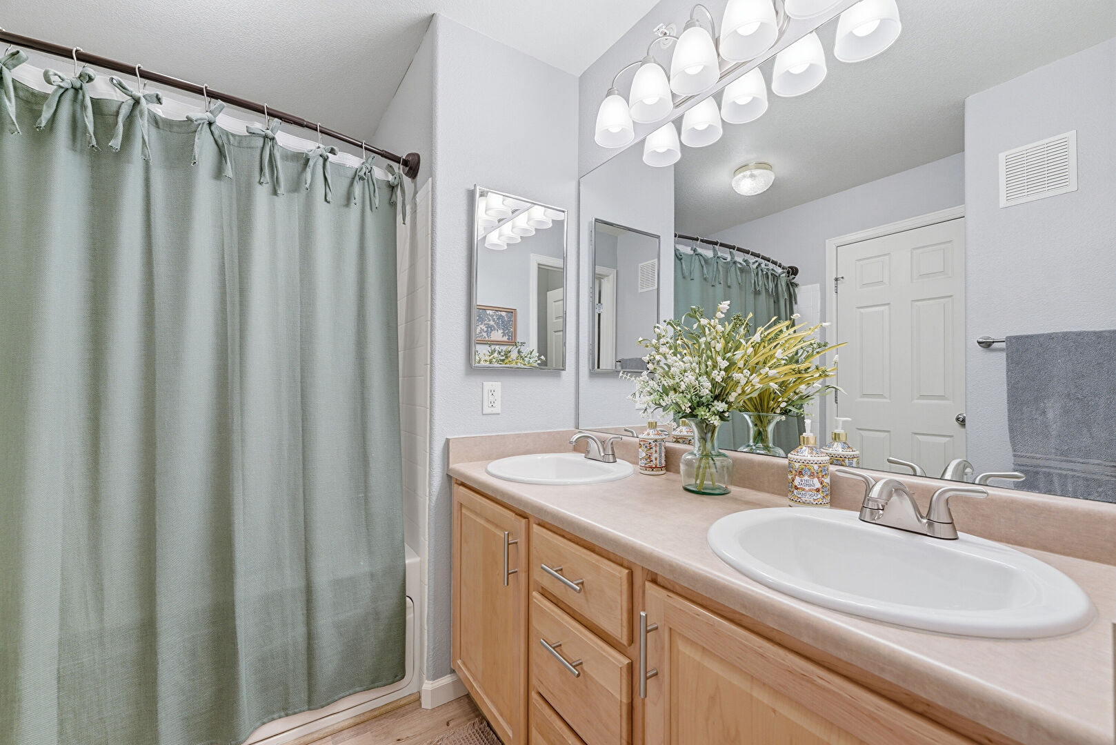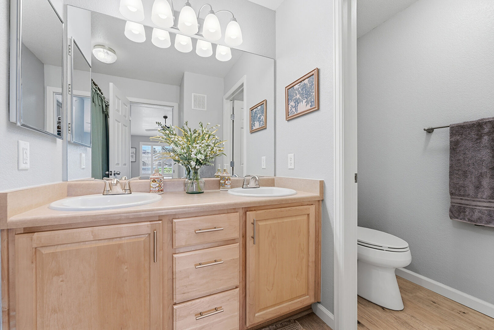 Baseboards Wall, Combined Bath Shower, Double Vanity, Drywall, Full Bathroom, Natural Light, Vent, Wood Finish Floor, Double Vanity, Water Closet