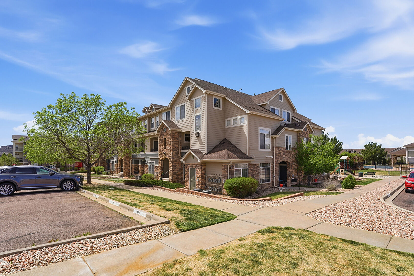 Central Ac, Downspout, Gutters, Horizontal Siding, Parking Lot, Playground, Stone Siding, Lawn, Parking Lot
