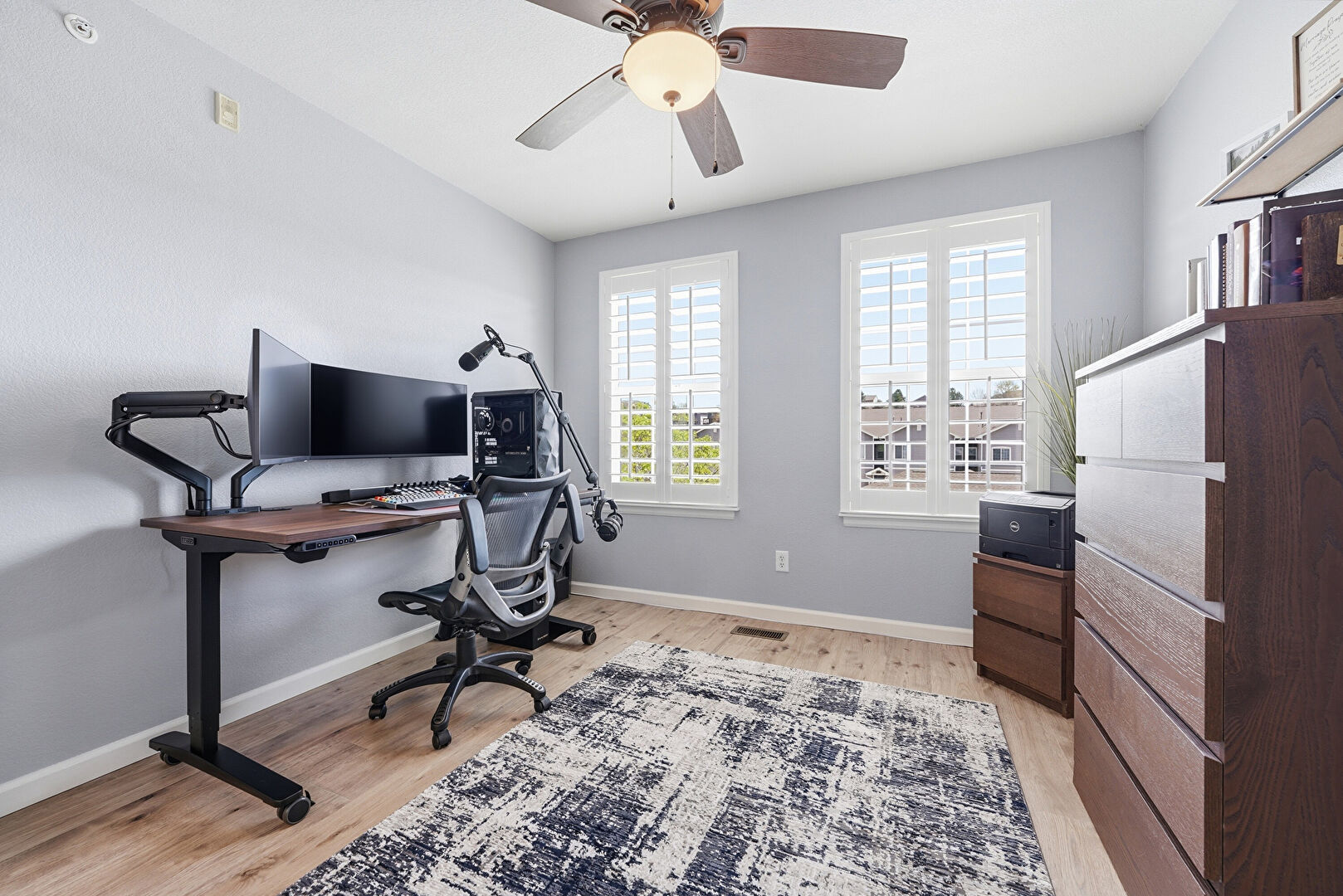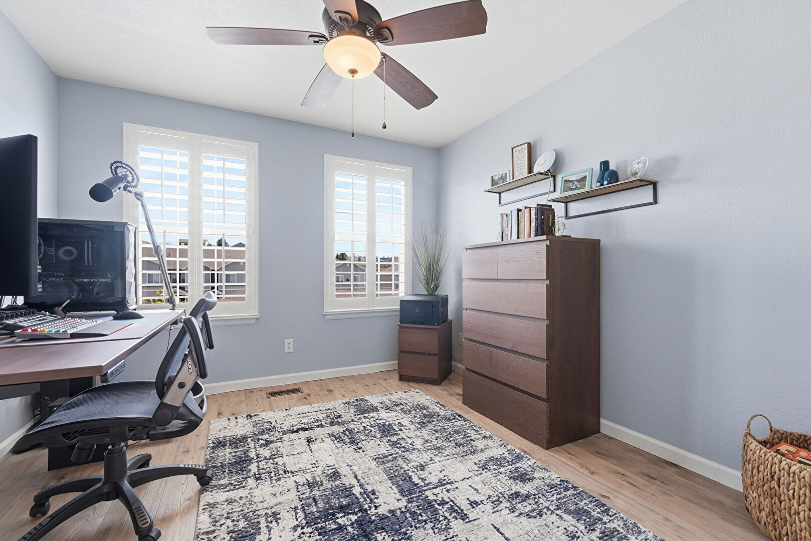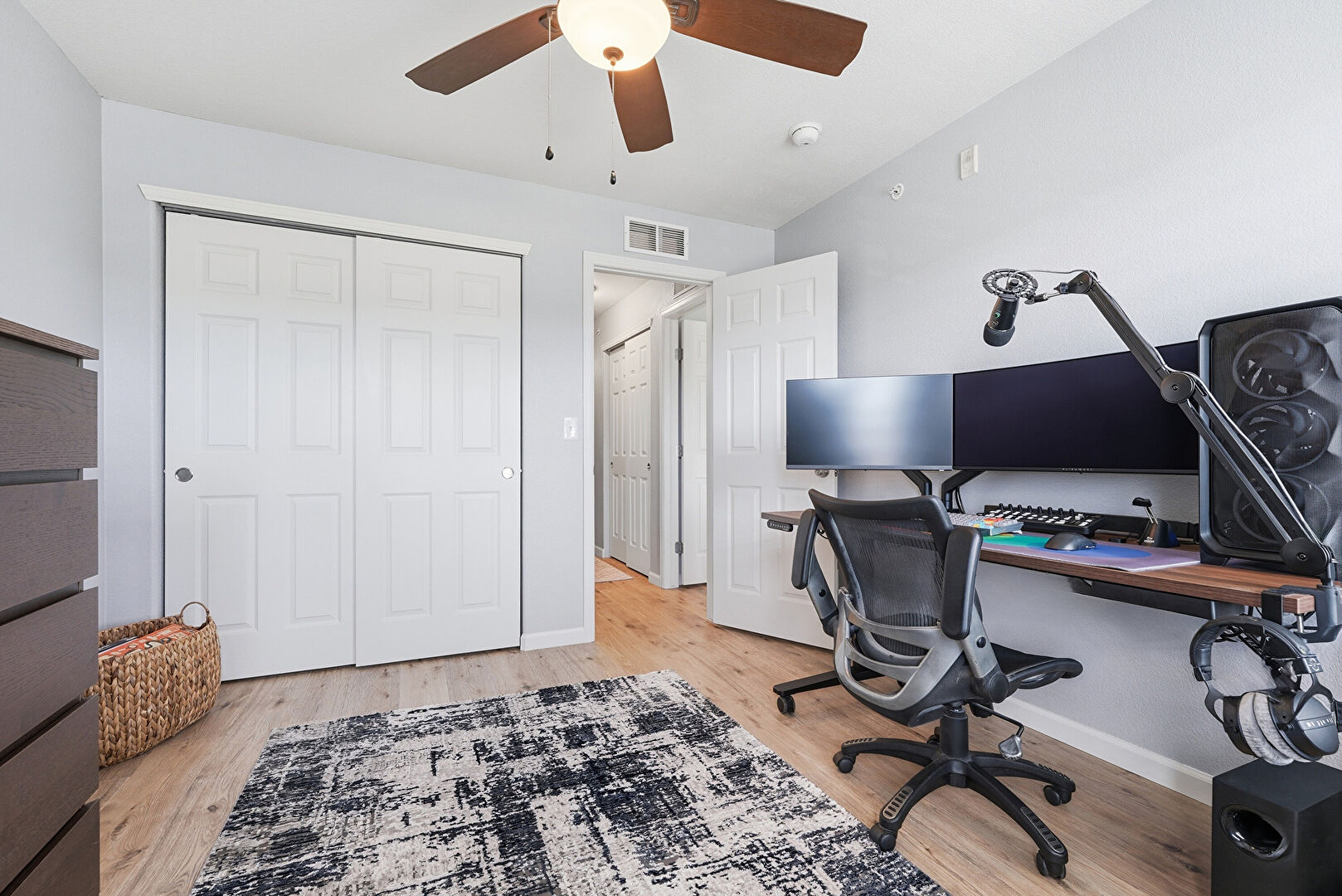 Baseboards Wall, Ceiling Fan, Drywall, Natural Light, Office Area, Smoke Carbon Monoxide Detector, Vent, Wood Finish Floor, Baseboards Wall, Office Area, Vent