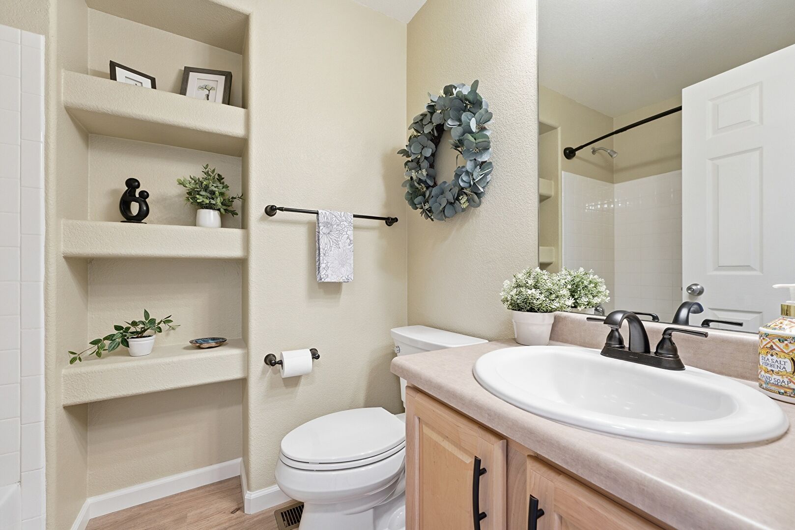 Baseboards Wall, Built In Shelves, Combined Bath Shower, Drywall, Full Bathroom, Vanity, Vent, Wood Finish Floor, Textured Wall, Wood Finish Floor