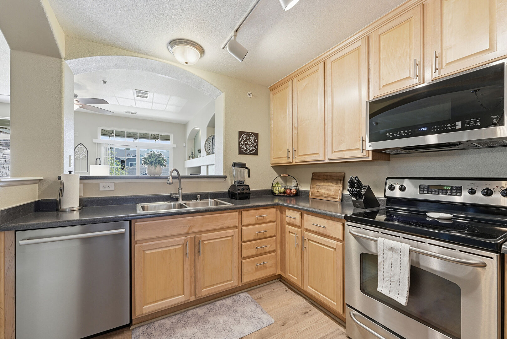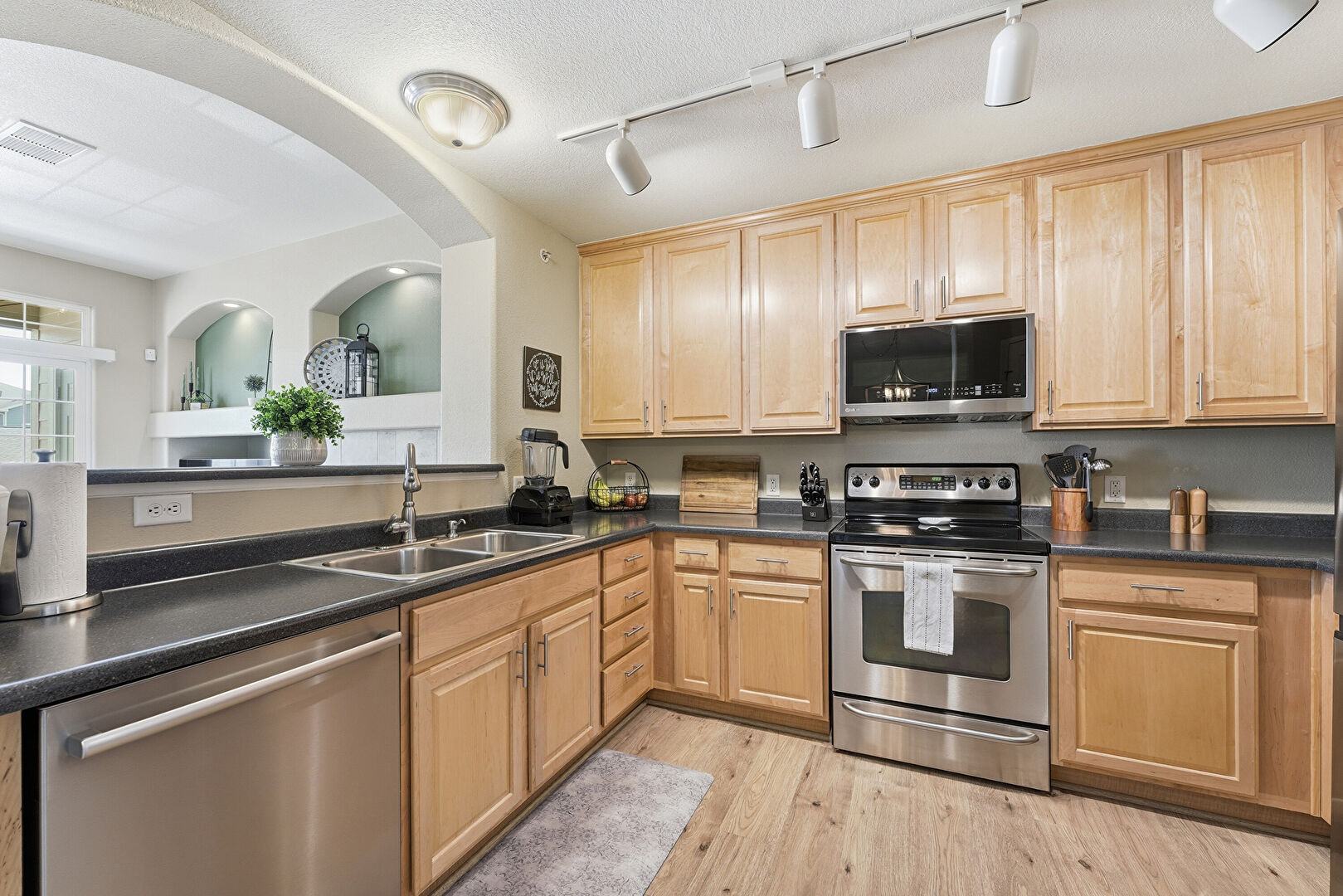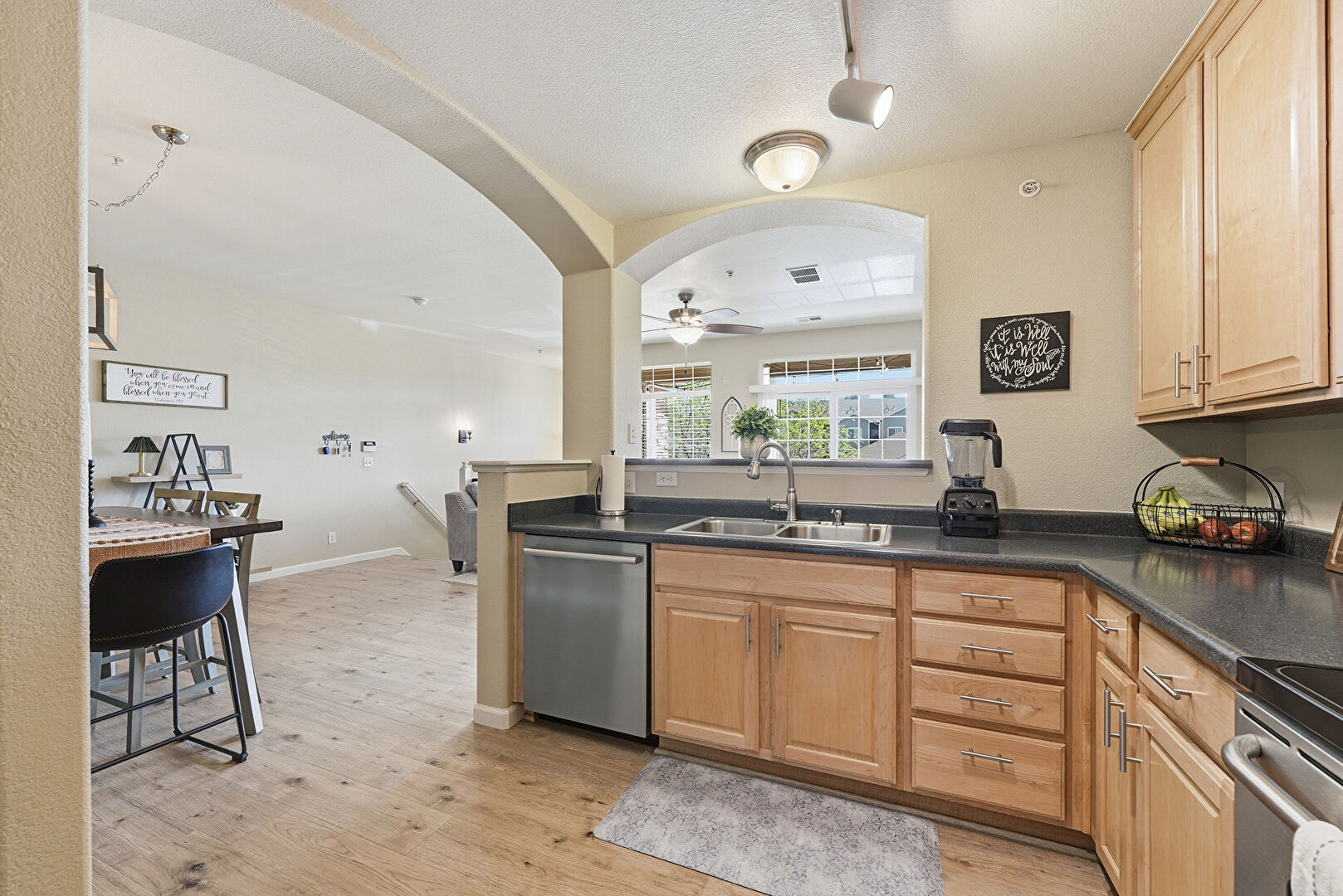 Arched Walkways, Baseboards Wall, Ceiling Fan, Crown Molding Cabinets, Drywall, Kitchen Peninsula, Natural Light, Opens To Living Area, Pass Through Window, Raised Cabinets, Textured Ceiling, Track Lighting, Vent, Wood Finish Floor, Crown Molding Cabinets, Raised Cabinets, Track Lighting, Wood Finish Floor