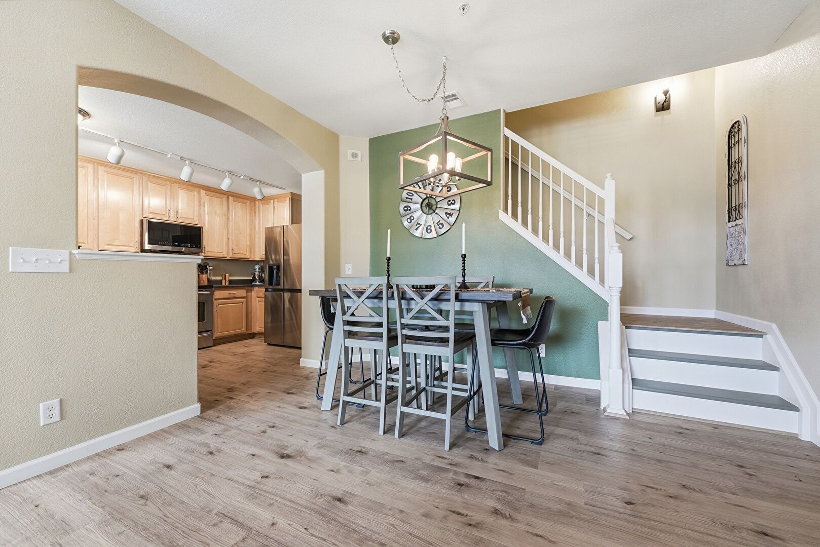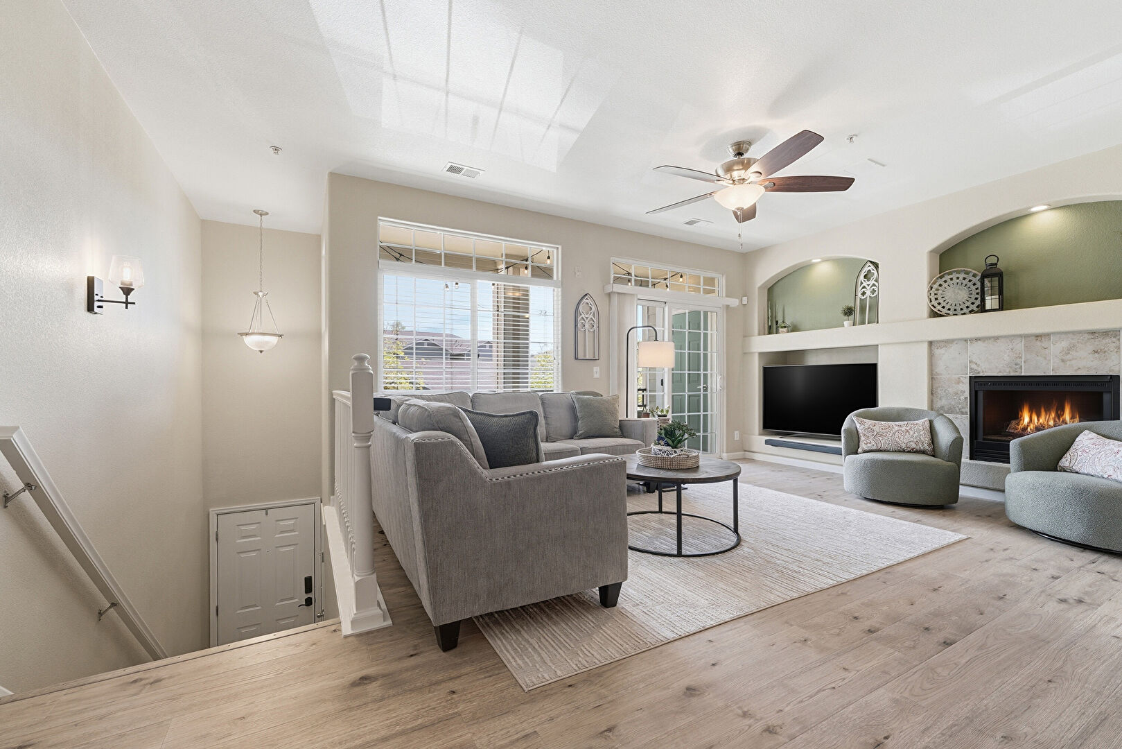 Arched Walkways, Baseboards Wall, Ceiling Fan, Drywall, Fireplace, Natural Light, Notable Chandelier, Smoke Carbon Monoxide Detector, Stairs, Track Lighting, Vaulted Ceiling, Vent, Wood Finish Floor, Notable Chandelier, Wood Finish Floor