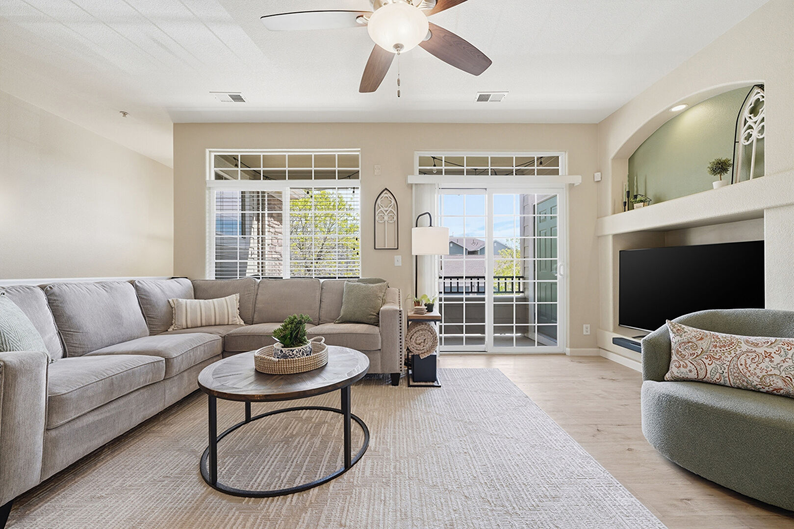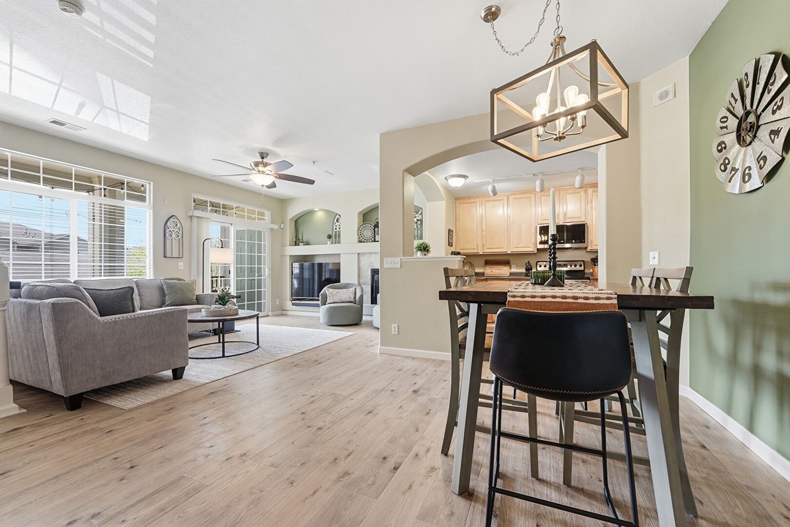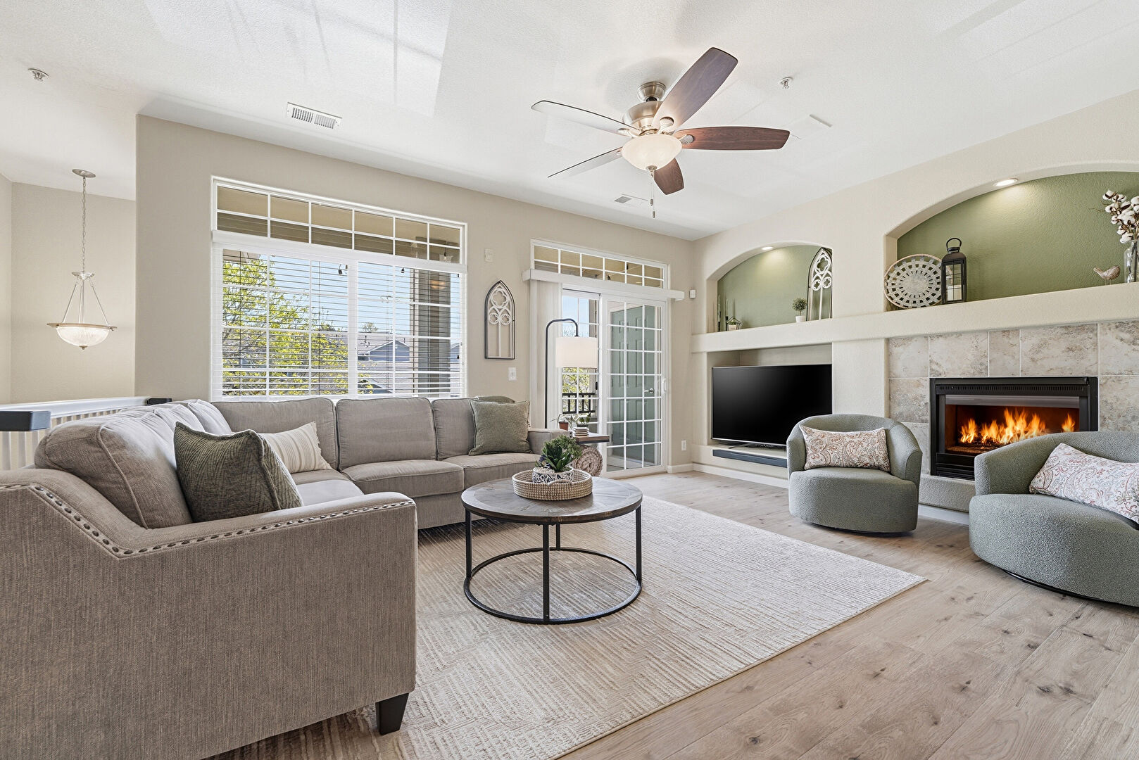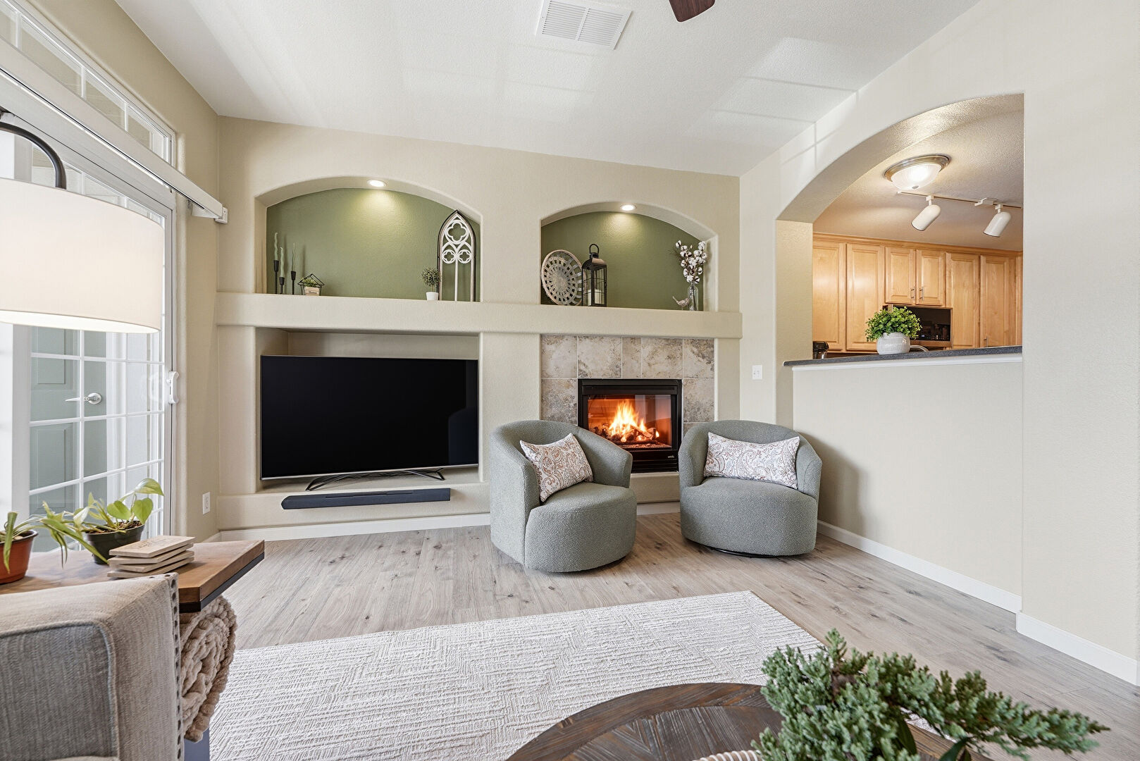 Arched Walkways, Baseboards Wall, Built In Shelves, Ceiling Fan, Drywall, Fireplace, Natural Light, Track Lighting, Vent, Wood Finish Floor, Baseboards Wall, Ceiling Fan, Natural Light, Vent, Wood Finish Floor