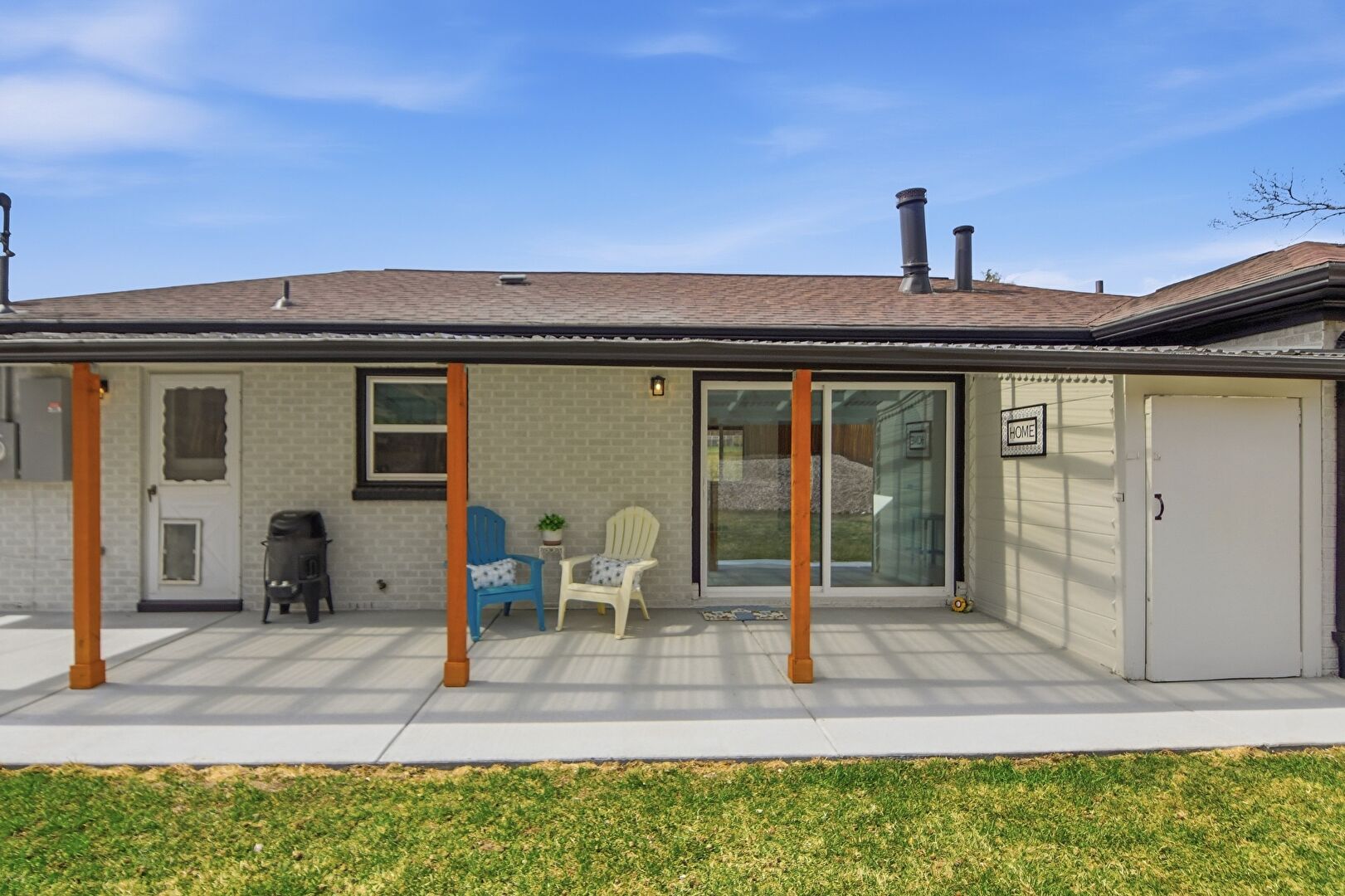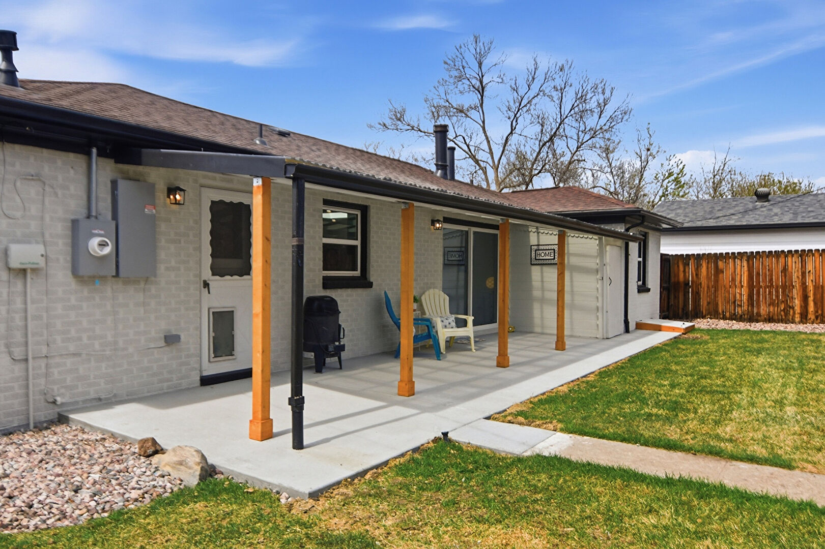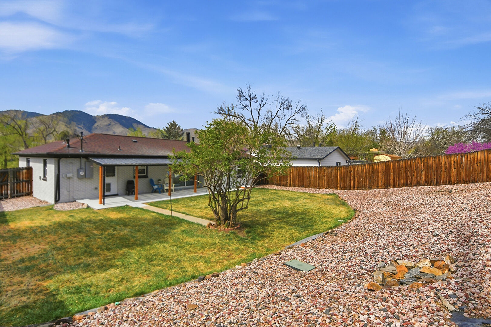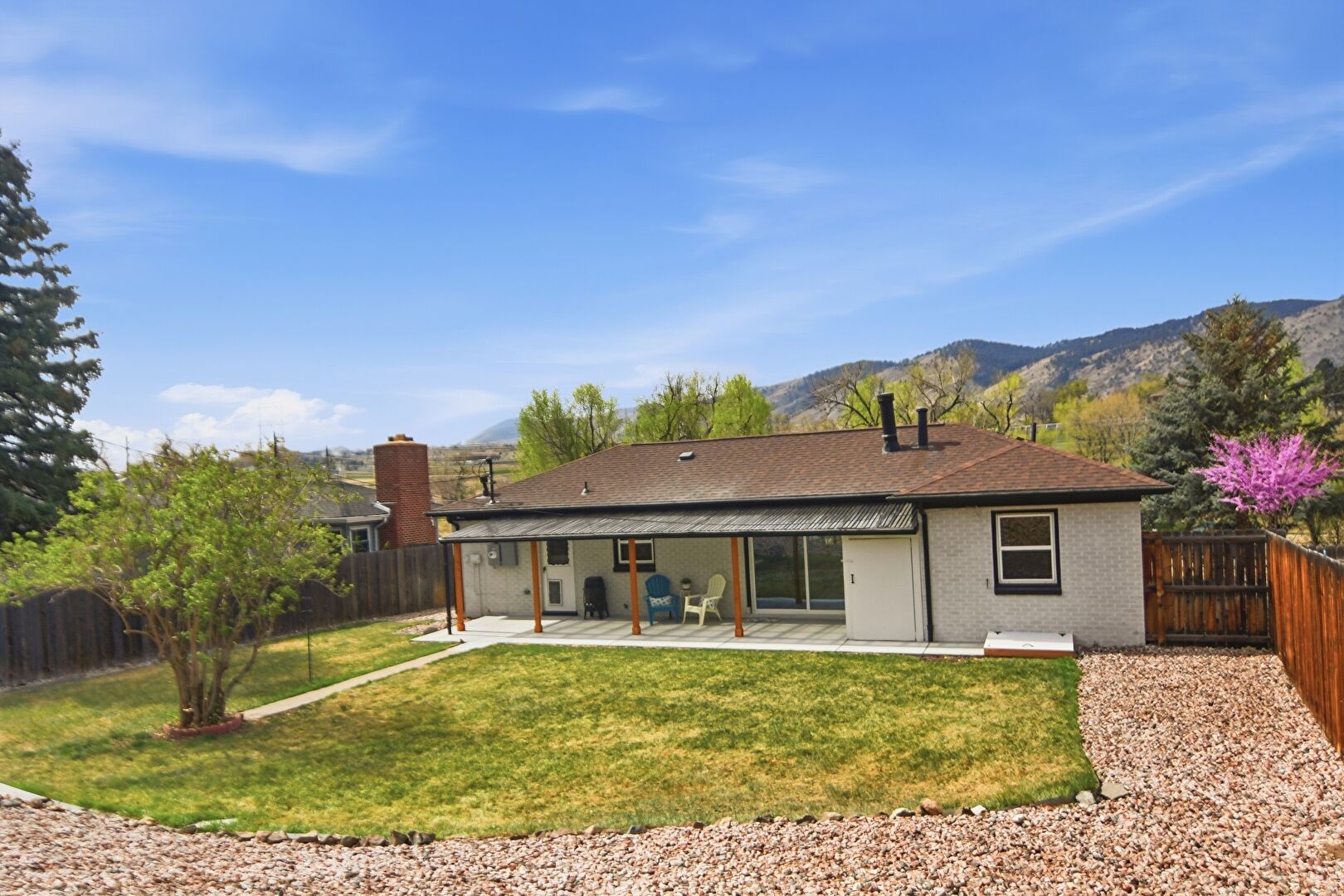 Brick Siding, Downspout, Electric Meter, Fence, Gutters, Lawn, Mountain View, Patio, Porch, Shingle Roof, Water Meter, Brick Siding, Electric Meter, Lawn, Patio