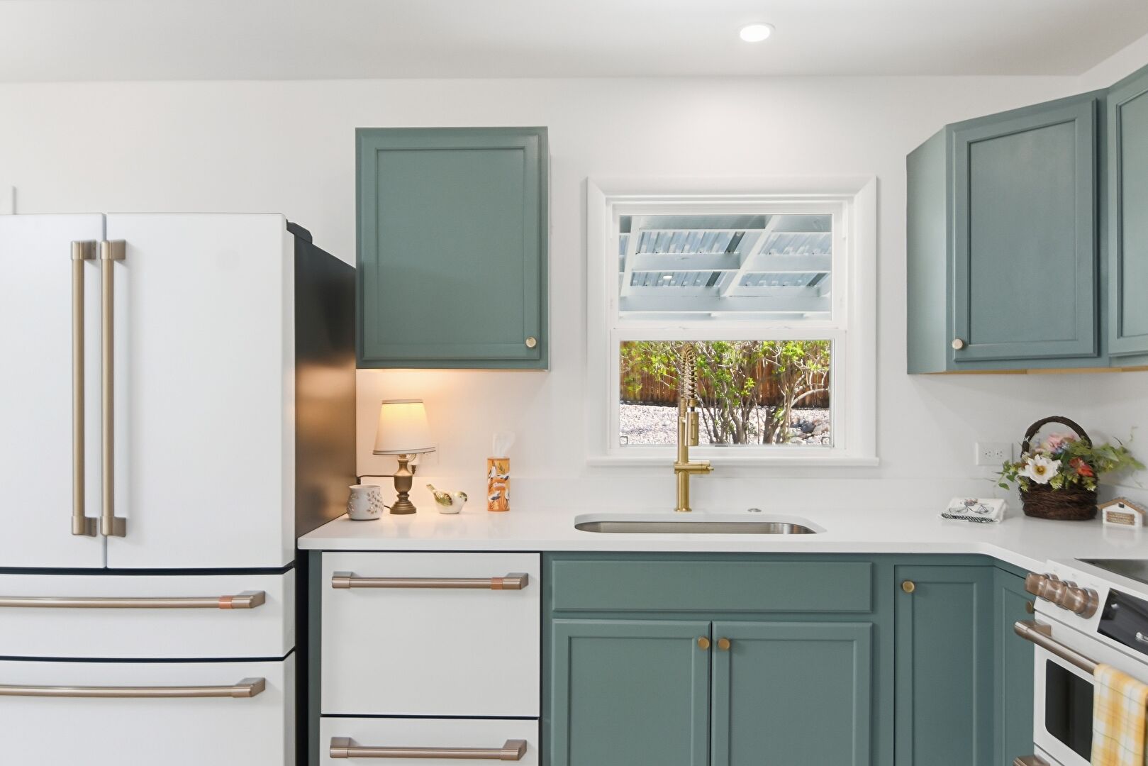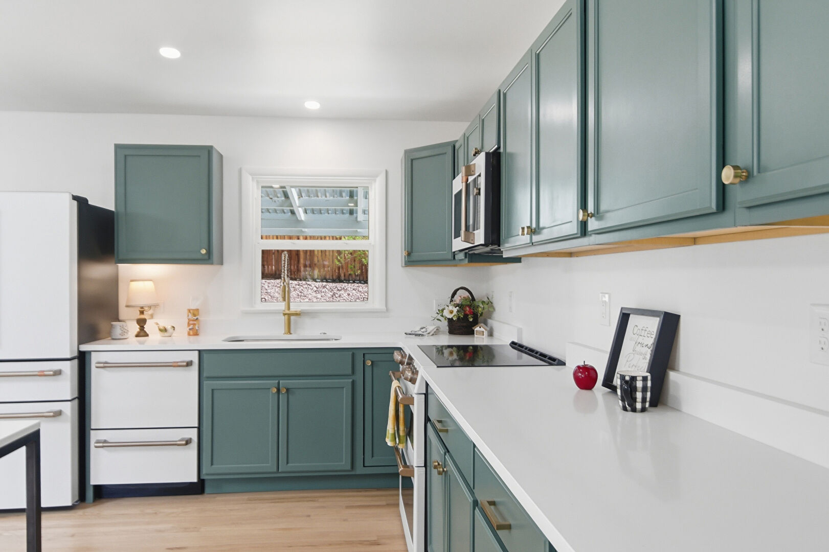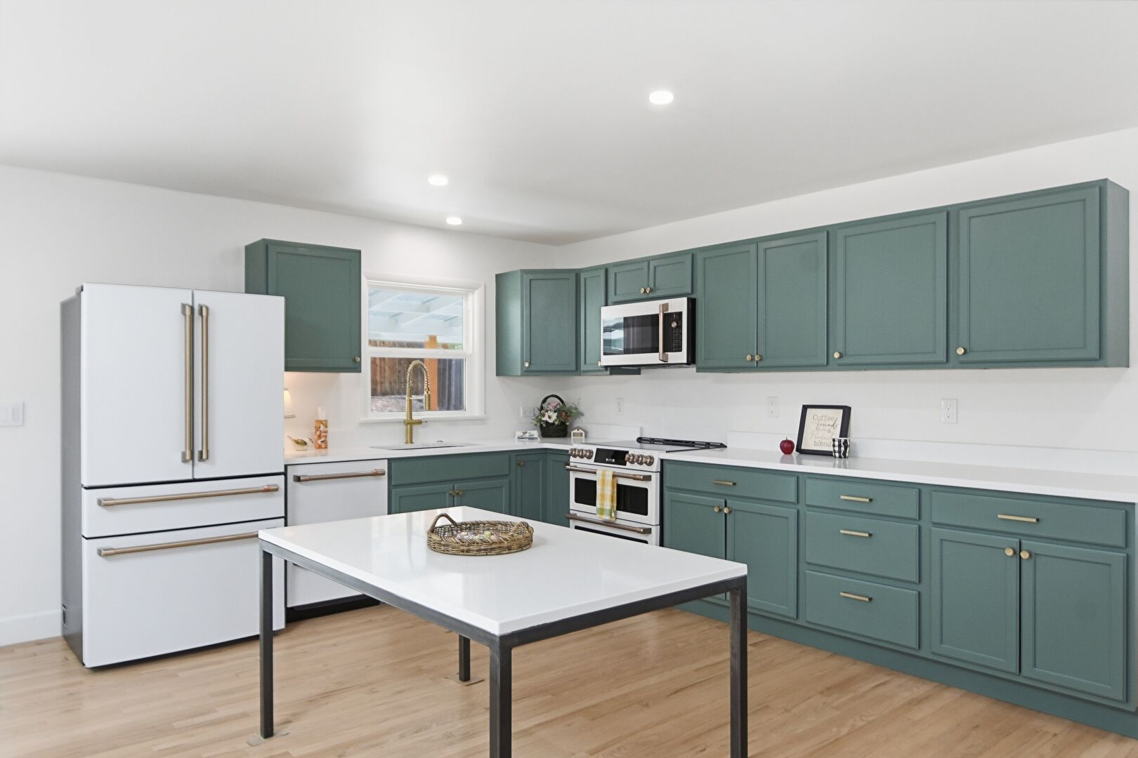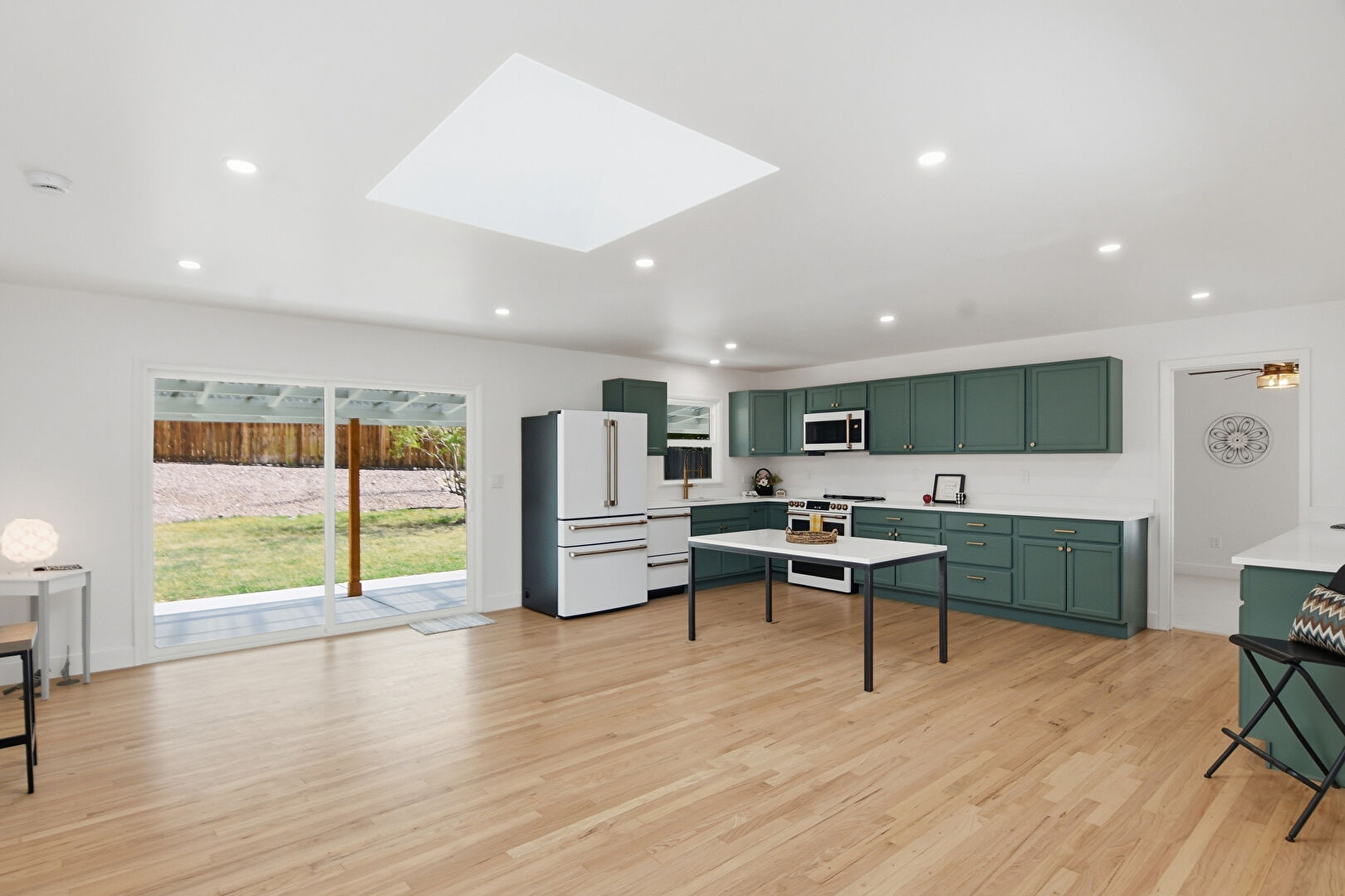 Drywall, Green Cabinets, Kitchen Bar, L Shaped Kitchen, Natural Light, Recessed Lighting, Shaker Cabinets, Skylight, Wood Finish Floor, Baseboards Wall