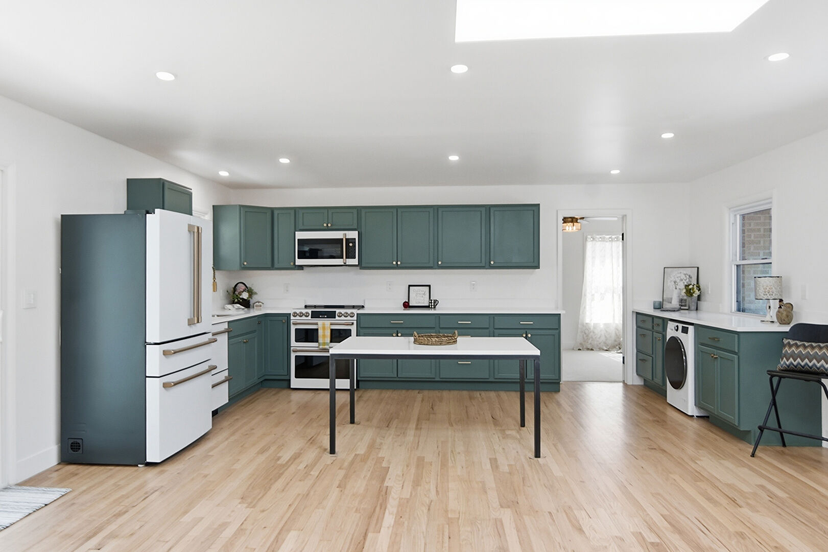 Drywall, Kitchen Bar, Laundry, Natural Light, Recessed Lighting, Shaker Cabinets, Skylight, U Shaped Kitchen, Washer Dryer, Wood Finish Floor, Green Cabinets