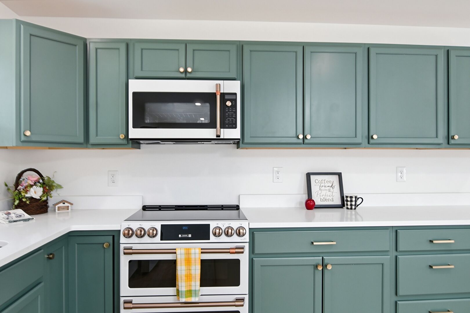 Arched Walkways, Baseboards Wall, Drywall, Green Cabinets, Kitchen Bar, L Shaped Kitchen, Natural Light, Recessed Lighting, Shaker Cabinets, Skylight, Stone Countertops, Vent, Warming Drawer, Wood Finish Floor, Baseboards Wall, Green Cabinets, Stone Countertops