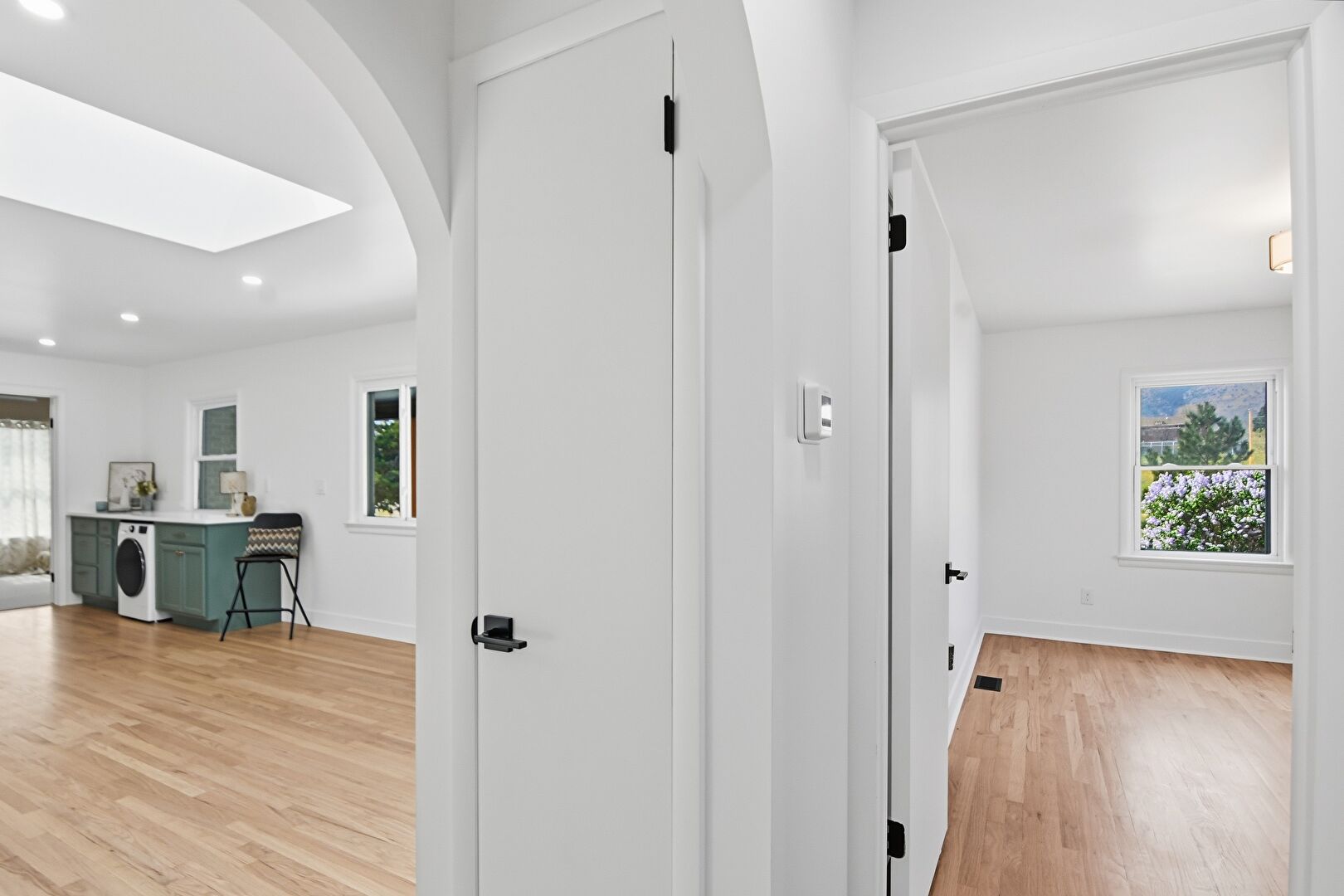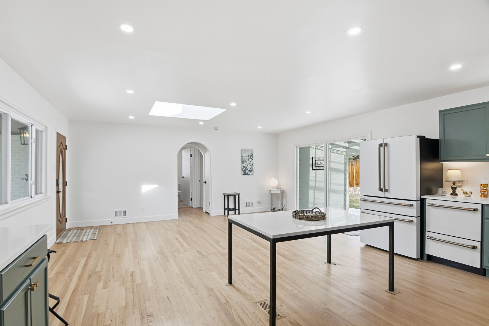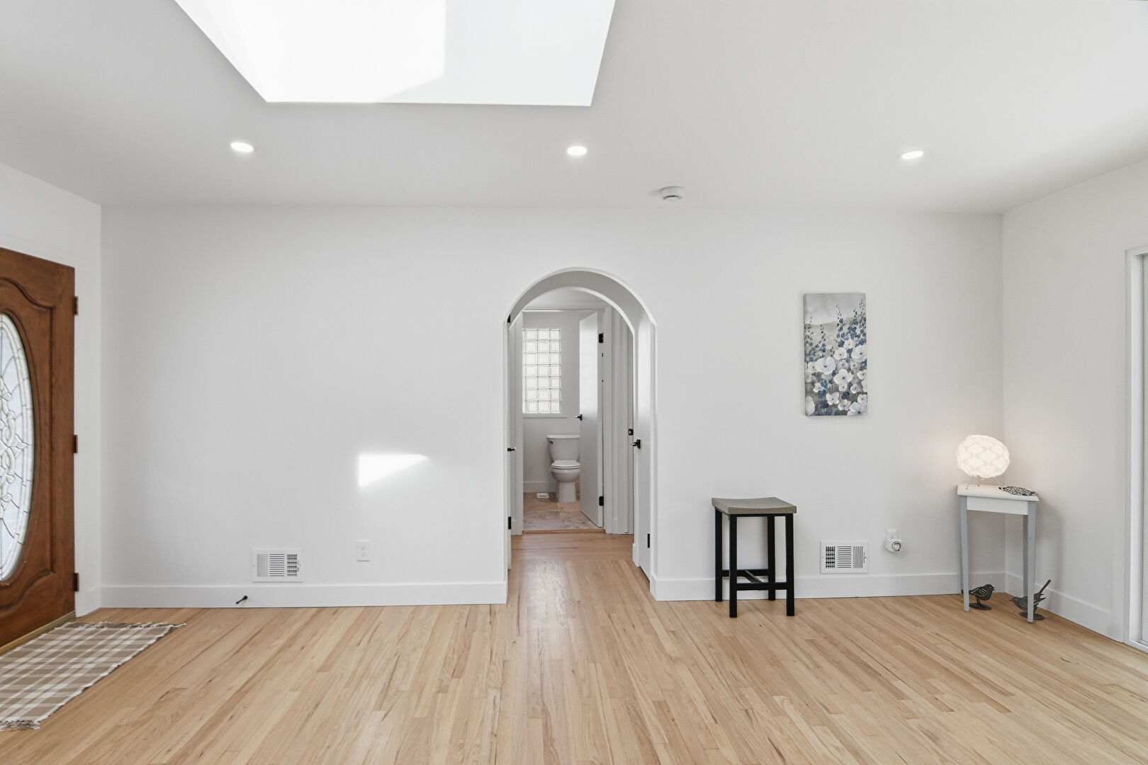 Arched Walkways, Baseboards Wall, Drywall, Recessed Lighting, Skylight, Vent, Wood Finish Floor, Natural Light