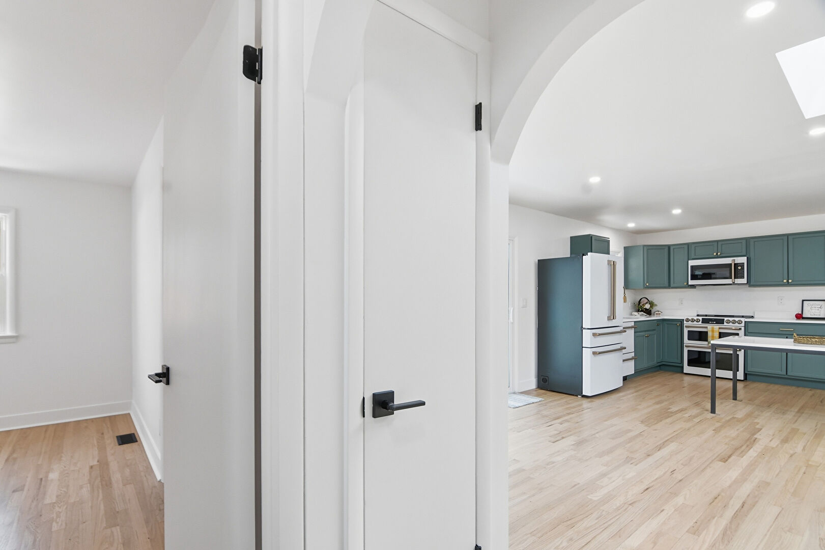 Arched Walkways, Baseboards Wall, Green Cabinets, Natural Light, Recessed Lighting, Shaker Cabinets, Skylight, Stone Countertops, Vent, Wood Finish Floor, Drywall