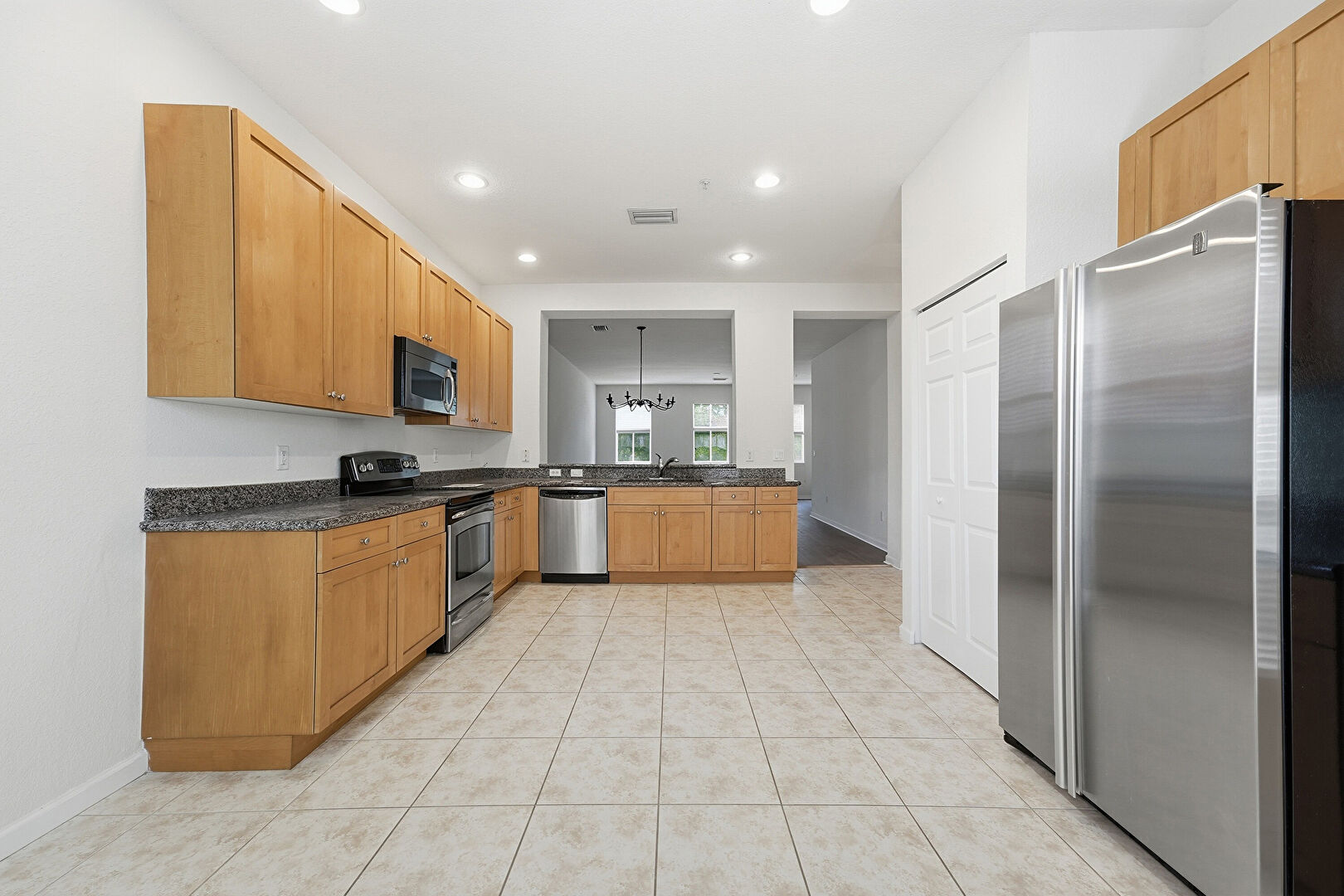 Baseboards Wall, Drywall, Kitchen Peninsula, Medium Brown Cabinets, Natural Light, Notable Chandelier, Pass Through Window, Pendant Lighting, Recessed Lighting, Shaker Cabinets, Stone Countertops, Tile Floor, Vent, Recessed Lighting, Vent