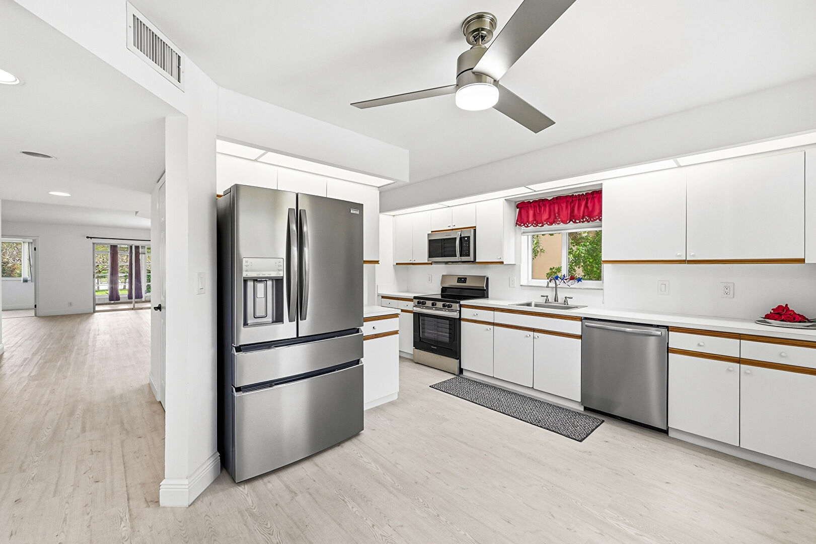 Baseboards Wall, Ceiling Fan, Drywall, Medium Brown Cabinets, Natural Light, Recessed Lighting, Vent, Wood Finish Floor, Medium Brown Cabinets, Wood Finish Floor