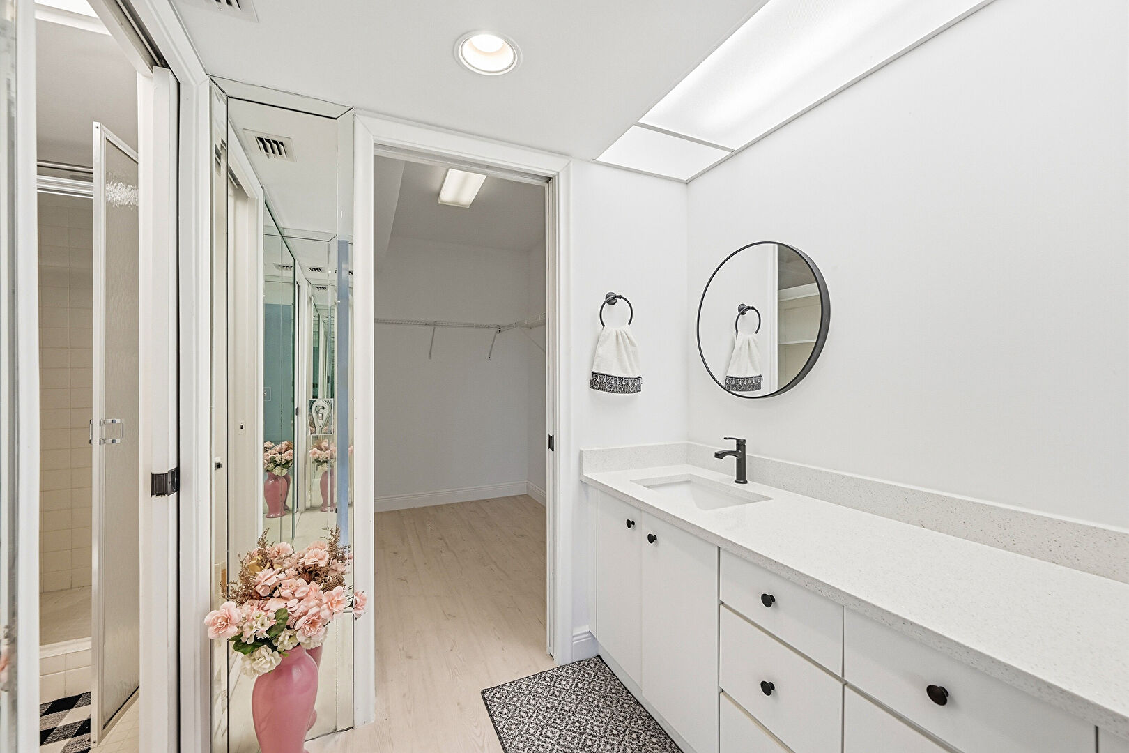 Baseboards Wall, Drywall, Full Bathroom, Recessed Lighting, Vanity, Vent, Wood Finish Floor, Walk In Closet