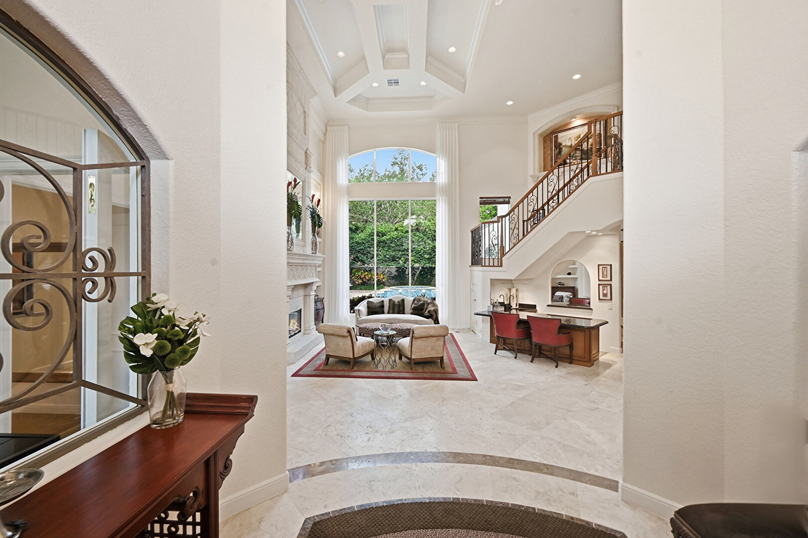 Baseboards Wall, Built In Shelves, Coffered Ceiling, Drywall, Fireplace, High Ceiling, Medium Brown Cabinets, Raised Cabinets, Recessed Lighting, Stairs, Stone Countertops, Wine Cooler, Natural Light