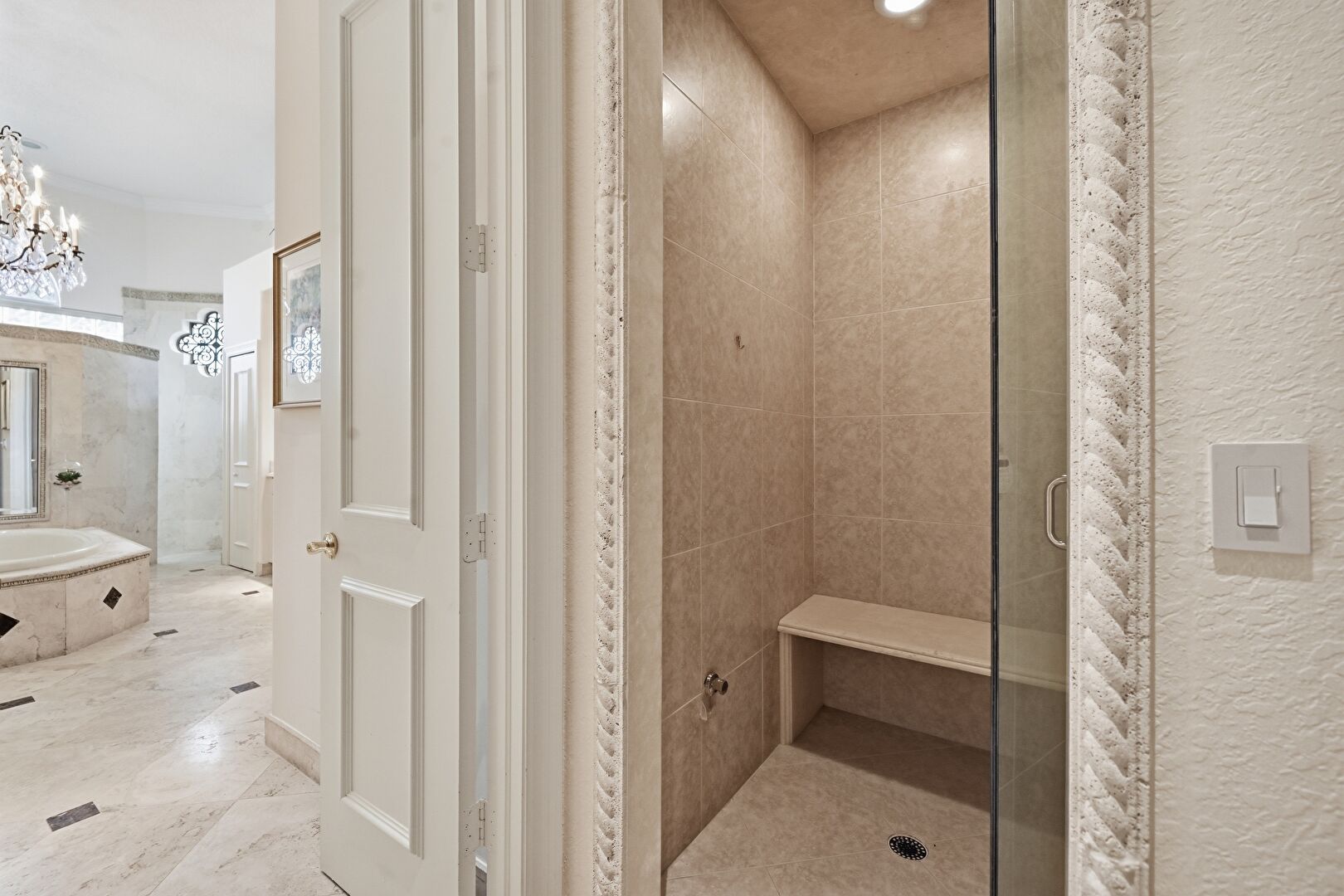 Full Bathroom, Recessed Lighting, Textured Wall, Notable Chandelier