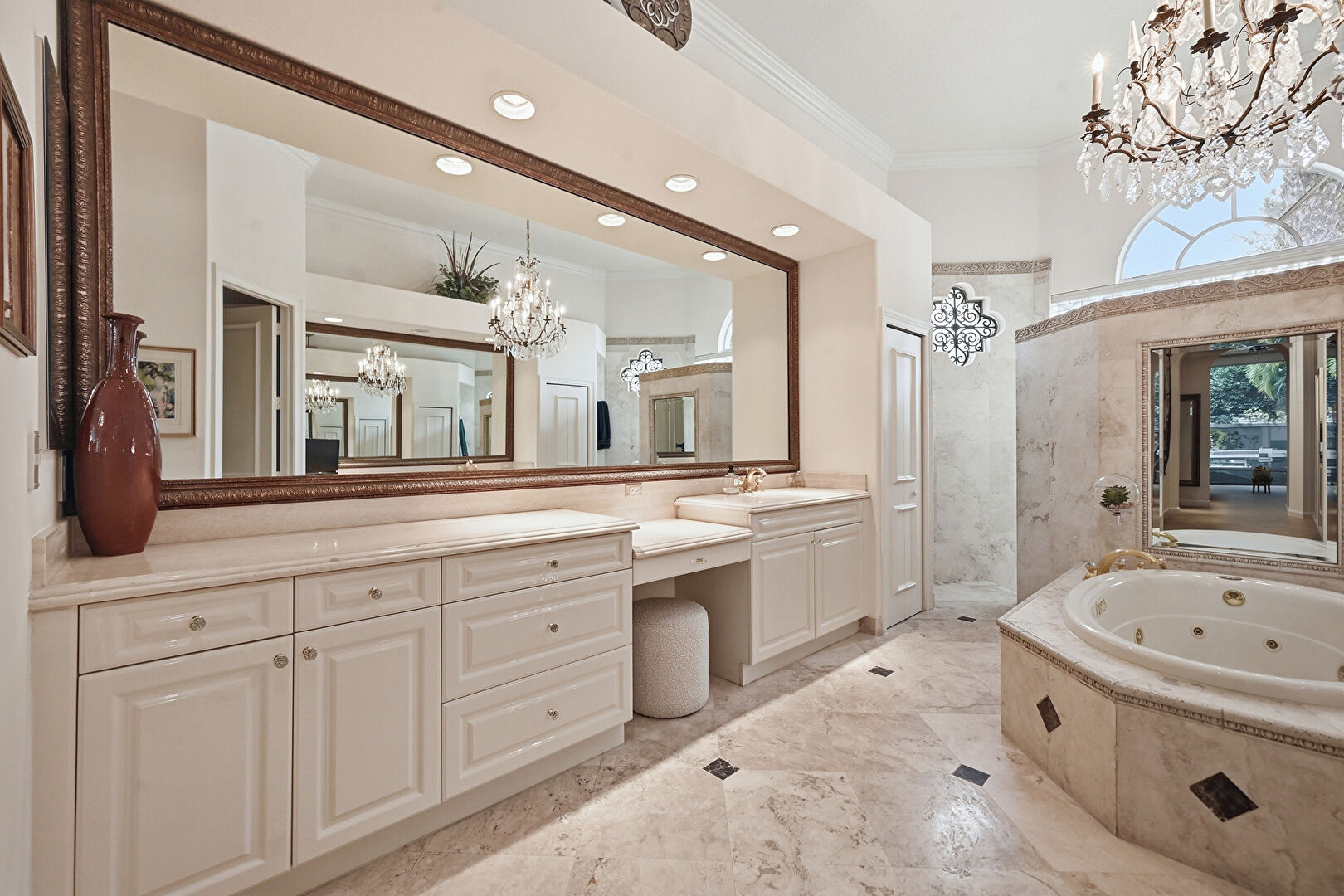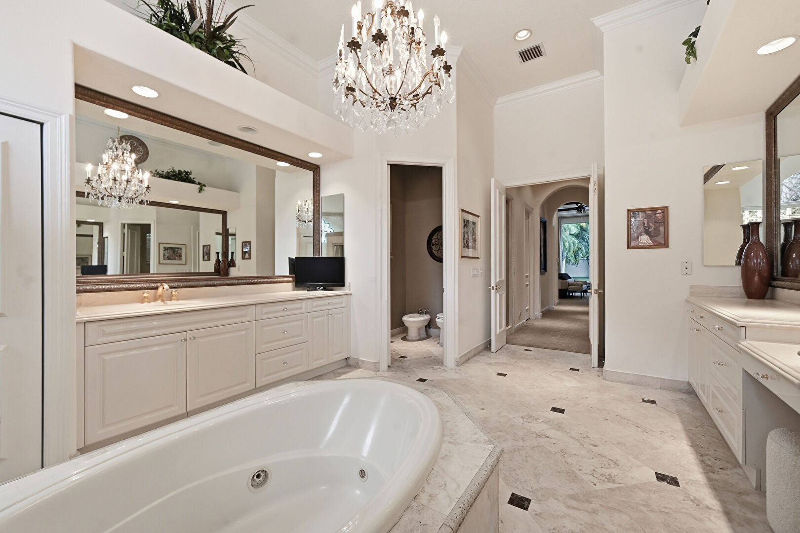 Baseboards Wall, Bidet, Crown Molding, Drywall, Full Bathroom, High Ceiling, Marble Finish Floor, Natural Light, Notable Chandelier, Recessed Lighting, Two Single Vanities, Vanity, Vent, Water Closet, Crown Molding, Natural Light, Notable Chandelier