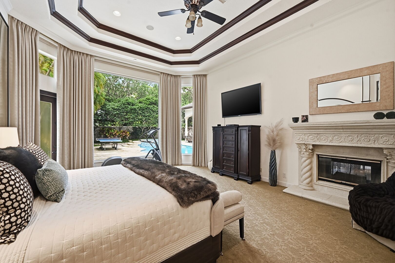 Access To Exterior, Arched Walkways, Baseboards Wall, Carpet, Ceiling Fan, Crown Molding, Drywall, Fireplace, Natural Light, Recessed Lighting, Tray Ceiling, Vent, Ceiling Fan, Crown Molding, Drywall, Natural Light