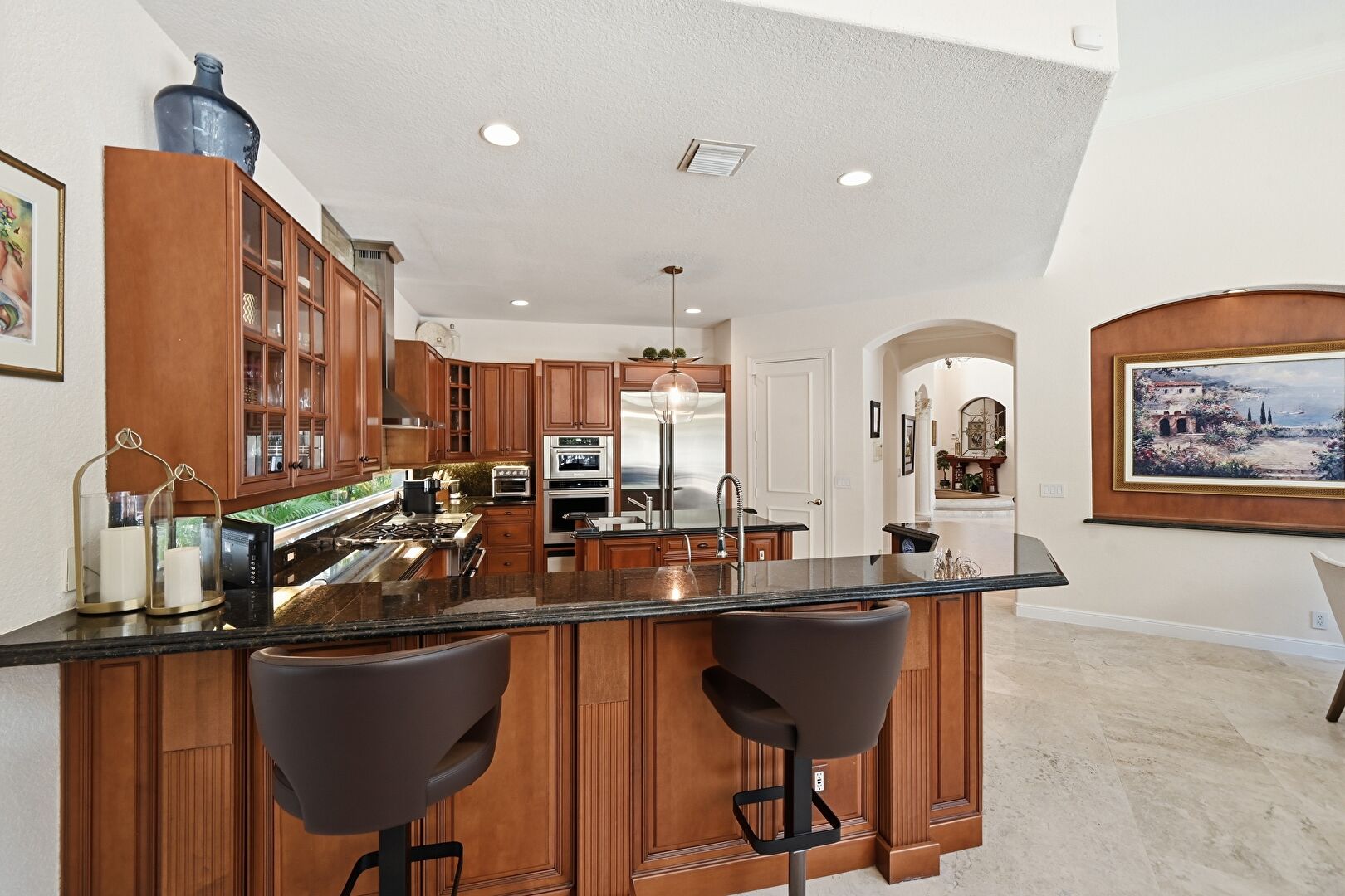 Arched Walkways, Baseboards Wall, Ceiling Fan, Crown Molding, Crown Molding Cabinets, Double Oven, Drywall, Glass Insert Cabinets, High Ceiling, Kitchen Bar, Kitchen Island, Kitchen Peninsula, Medium Brown Cabinets, Natural Light, Opens To Living Area, Pendant Lighting, Raised Cabinets, Recessed Lighting, Stone Countertops, Textured Ceiling, Toaster, Trash Compactor, Tray Ceiling, U Shaped Kitchen, Vent, Glass Insert Cabinets, Kitchen Bar, Natural Light, Raised Cabinets, U Shaped Kitchen, Warming Drawer